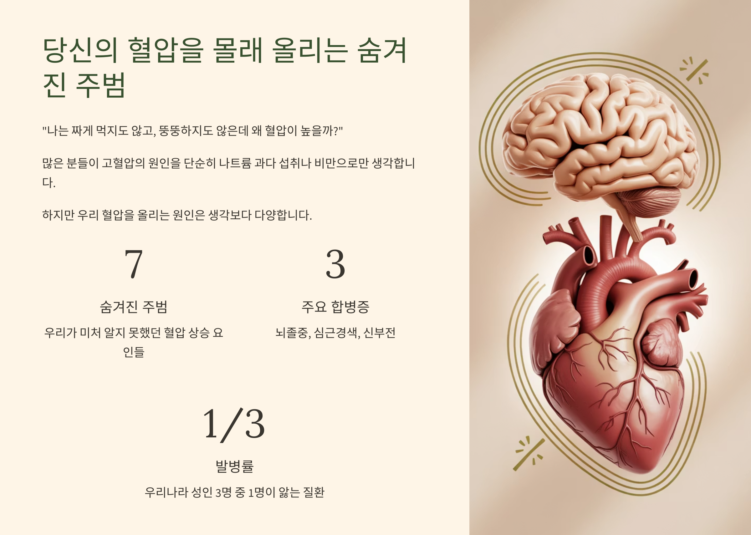 "나는 짜게 먹지도 않고, 뚱뚱하지도 않은데 왜 혈압이 높을까?" 많은 분들이 고혈압의 원인을 단순히 나트륨 과다 섭취나 비만으로만 생각하는 경향이 있습니다. 하지만 우리 혈압을 올리는 원인은 생각보다 다양하며, 때로는 우리가 미처 알지 못했던 '숨겨진 주범'들이 도사리고 있을 수 있습니다. 지금부터 그 7가지 주범들을 낱낱이 파헤쳐 보겠습니다!