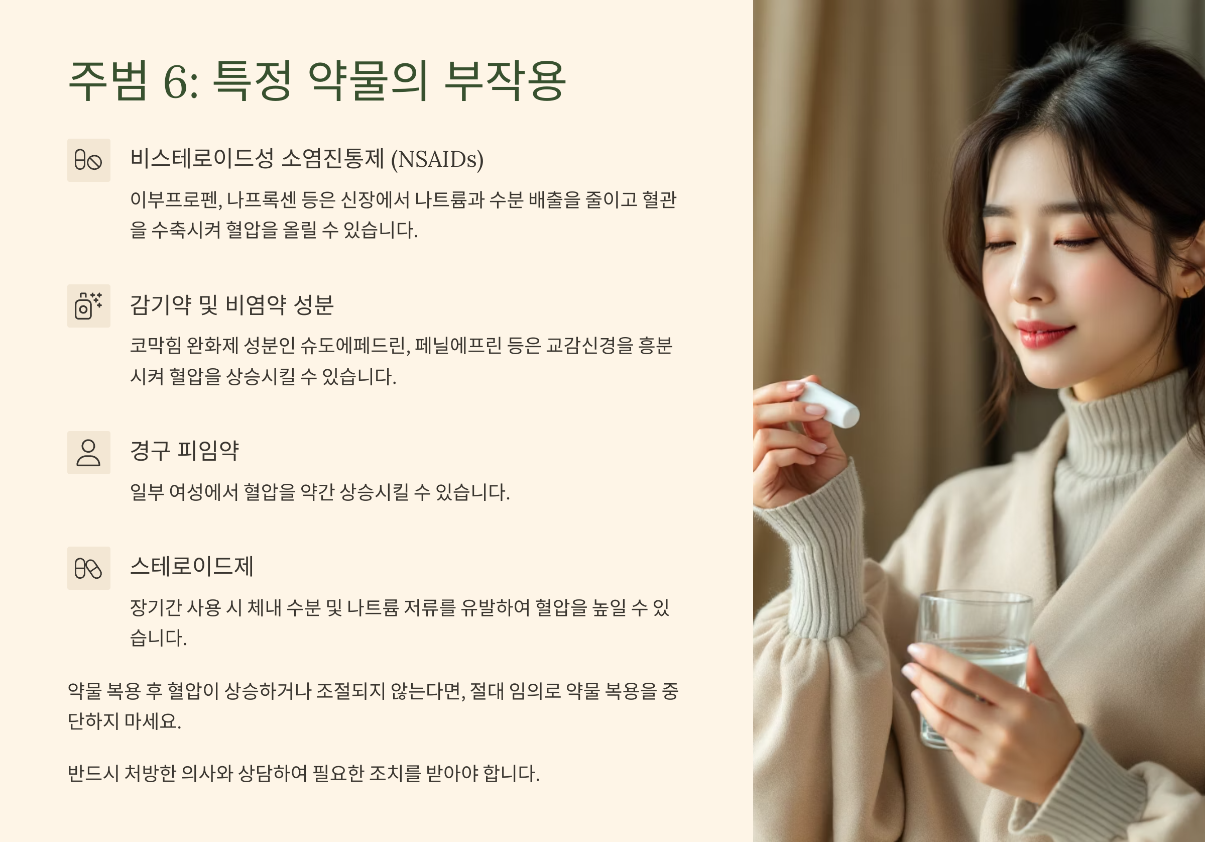 나. 약물 복용 시 혈압 변화 주의 및 안전한 대처법 (임의 중단 금지, 의사/약사 상담)