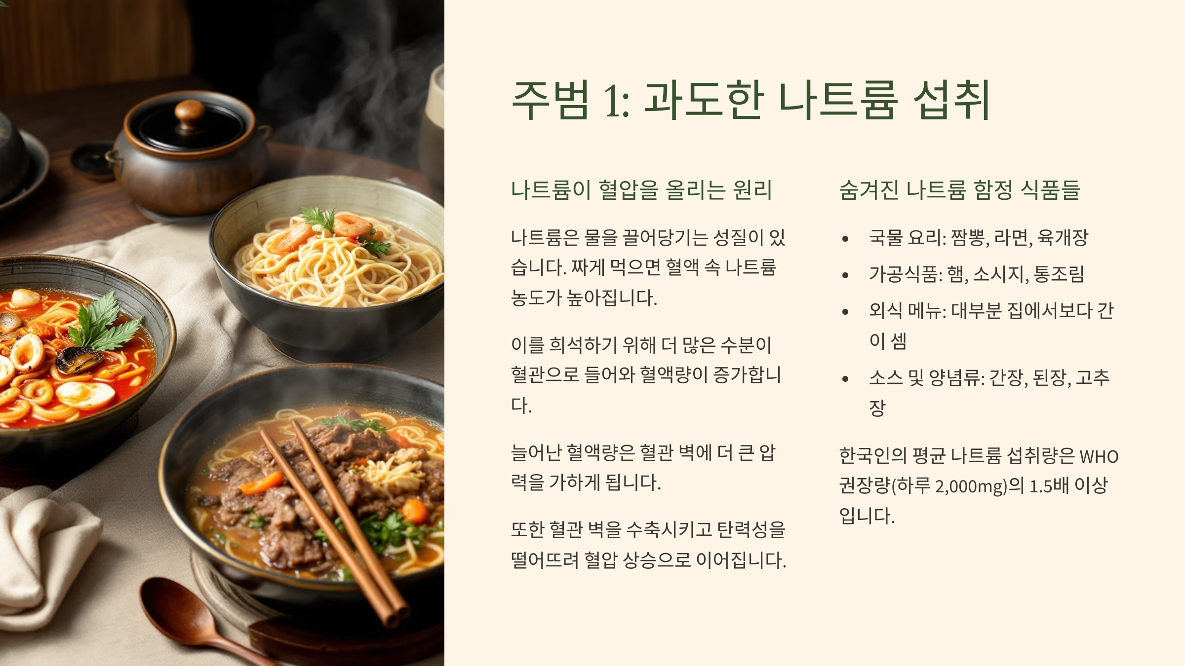 - (1) 주범 1: 과도한 나트륨 섭취 (한국인의 밥상, 정말 괜찮을까요?)