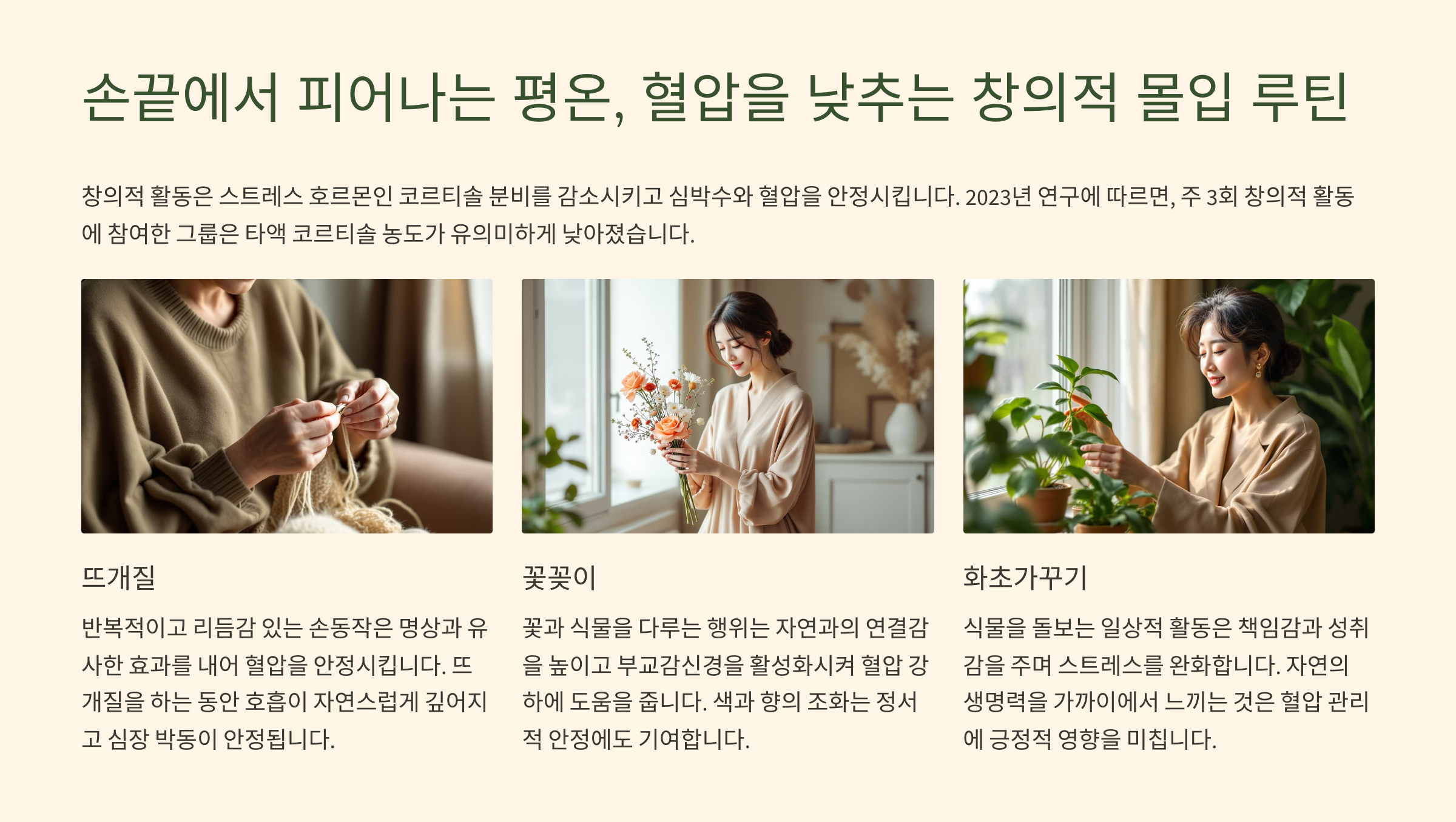 - 루틴 2: "손끝에서 피어나는 평온, 혈압을 낮추는 '창의적 몰입' 아트 테라피 루틴 🎨🧶🪴"