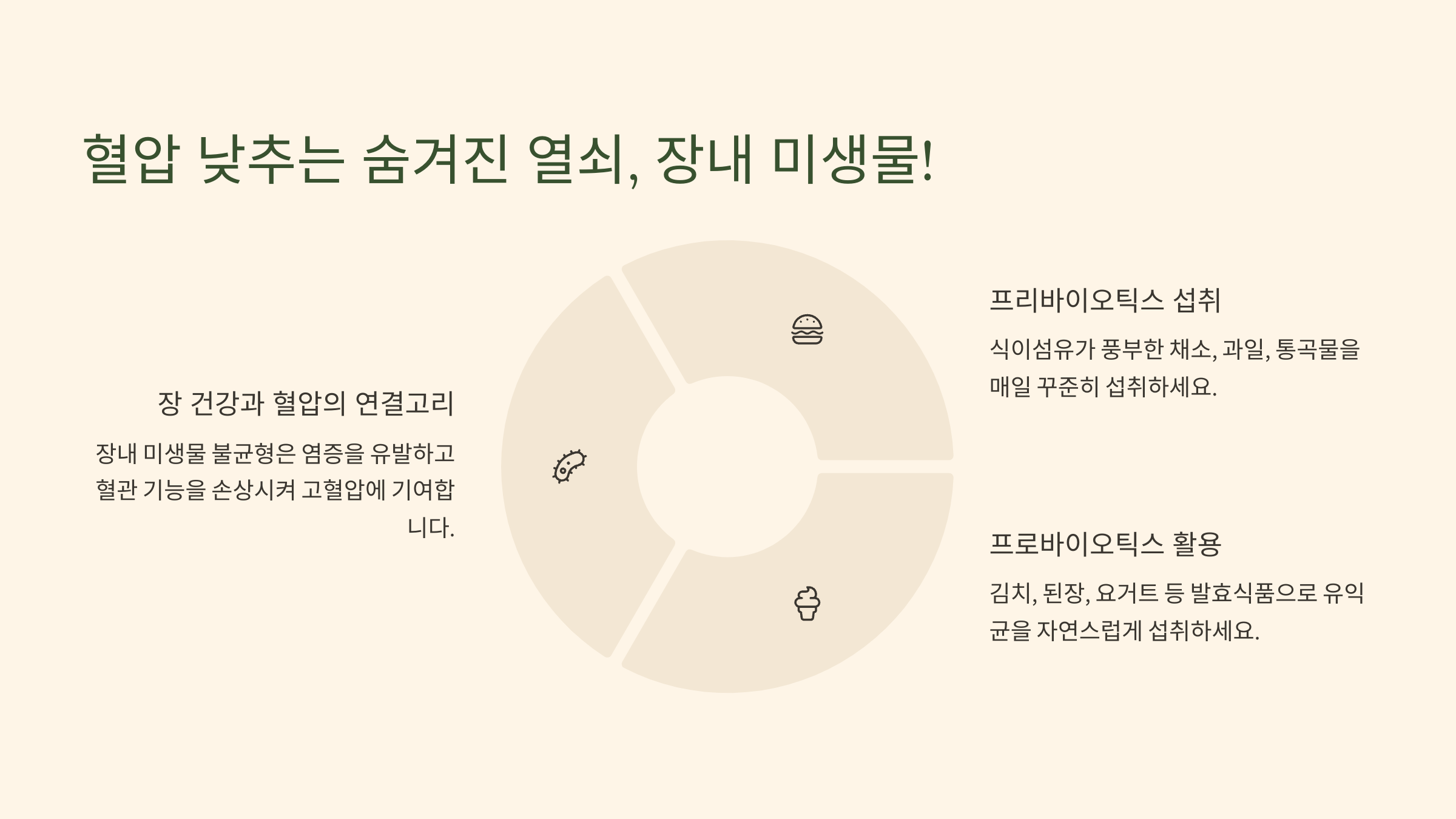 - 팁: "모든 프로바이오틱스가 혈압에 직접적인 영향을 주는 것은 아닙니다. 하지만 건강한 장내 환경은 전반적인 혈압 관리에 긍정적인 기반이 됩니다. 특정 균주(예: *Lactobacillus plantarum*, 일부 *Bifidobacterium* 종)가 혈압 강하에 도움이 될 수 있다는 연구도 있지만, 아직 더 많은 연구가 필요합니다. (균주 선택 및 제품 정보는 '건강 밥상' 편에서 상세히!)"