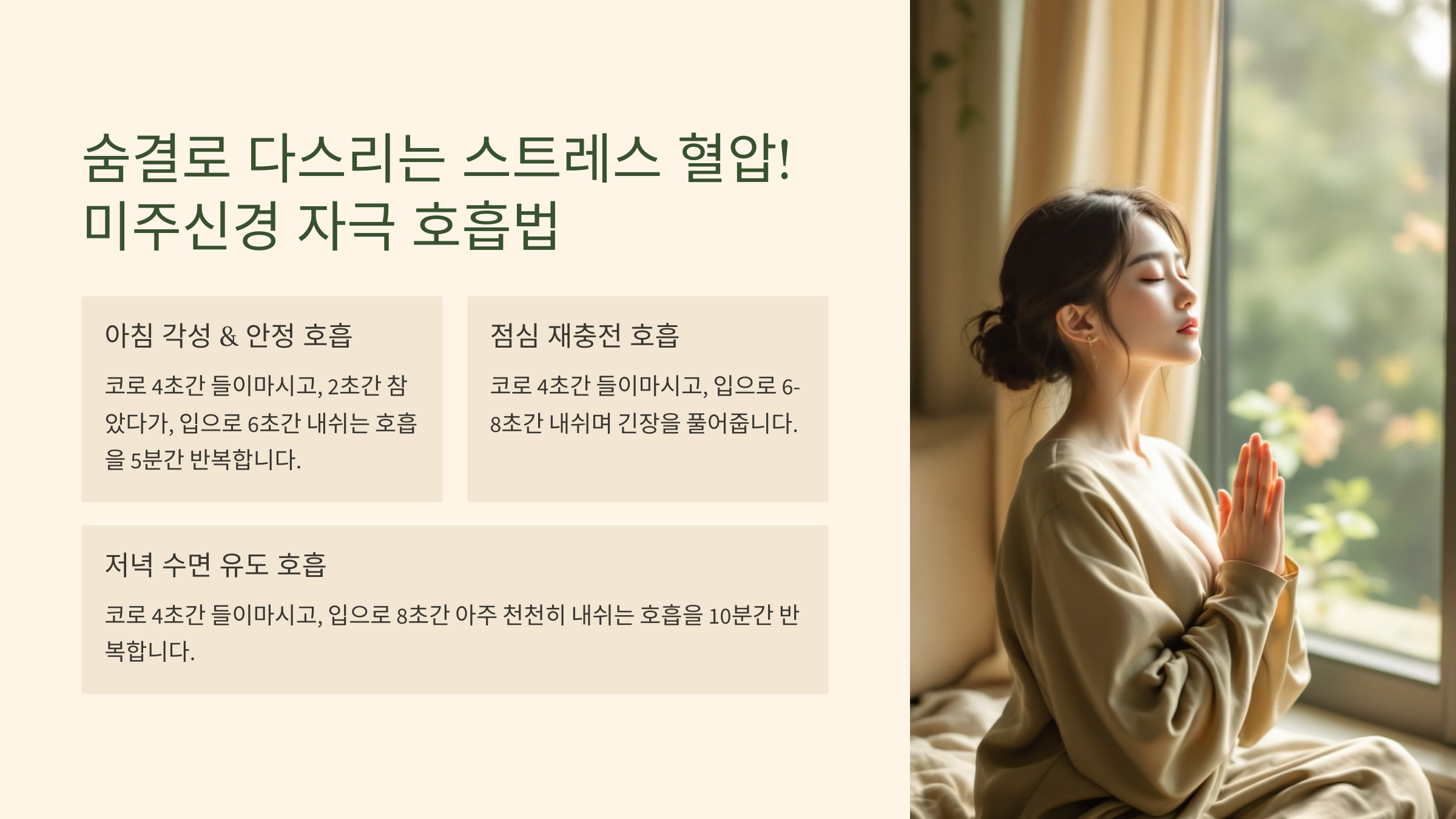 - 이것을 3~4회 반복합니다. "이 호흡법은 하버드 의과대학 앤드류 웨일 박사가 제안한 방법으로, 신경계를 진정시키는 효과가 뛰어납니다."