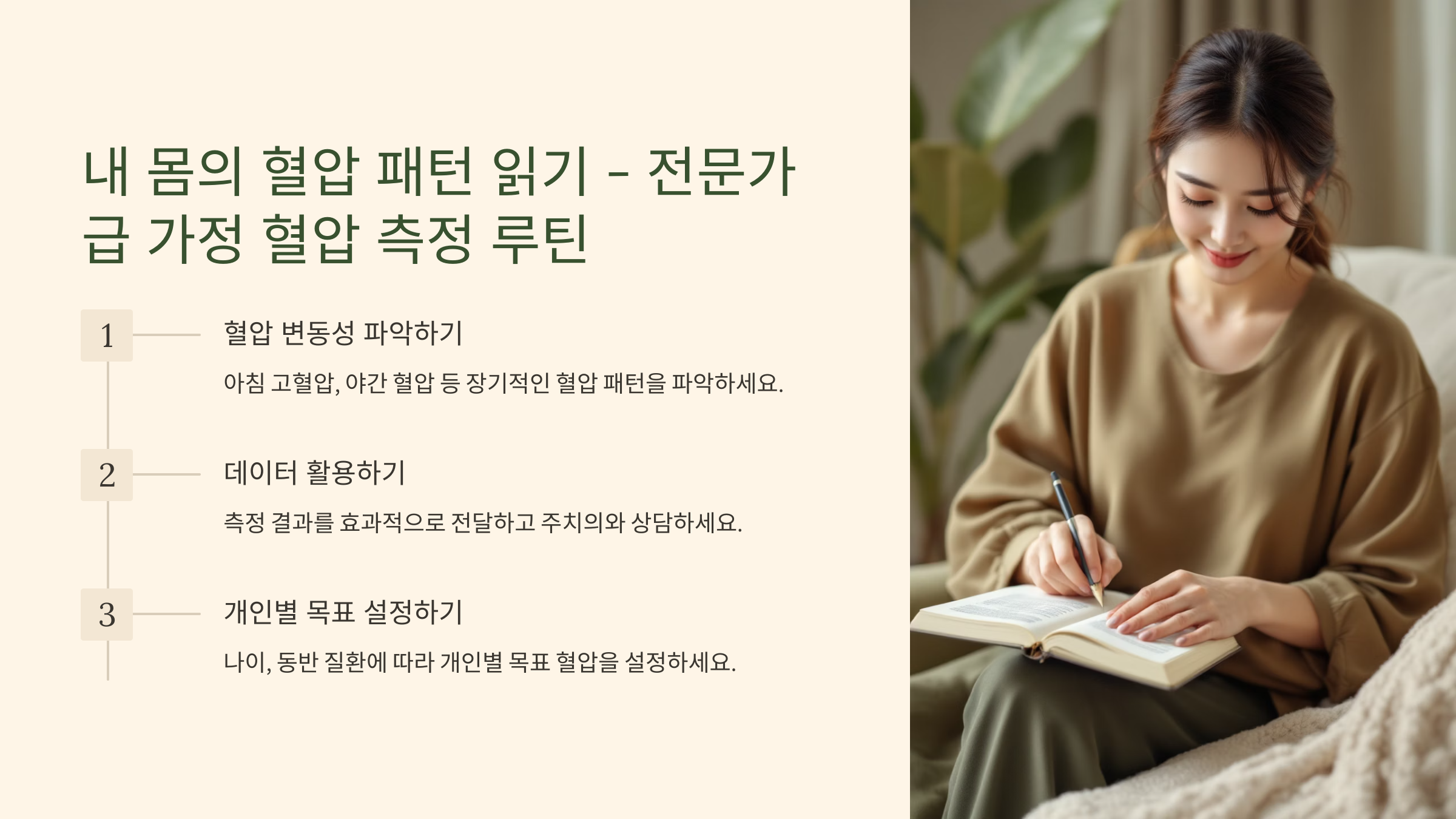 - 루틴: 주치의와 상담하여 나의 목표 혈압을 명확히 설정하고, 가정 혈압 측정을 통해 목표 혈압에 잘 도달하고 있는지 꾸준히 모니터링합니다.