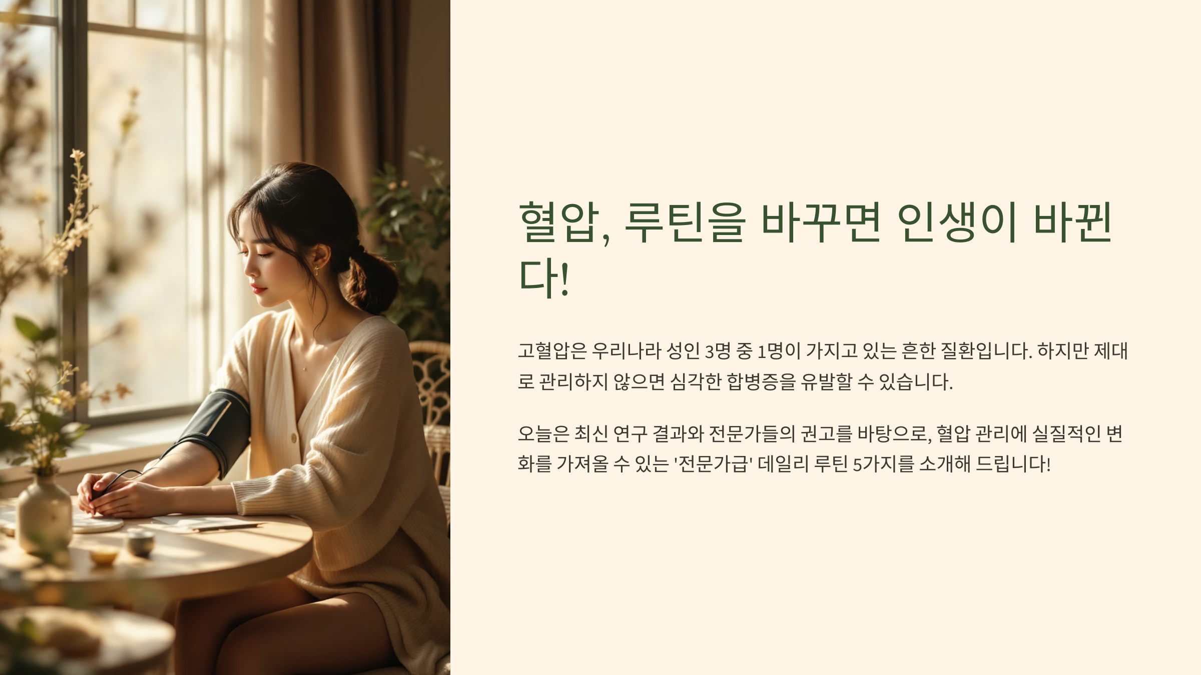 오늘 핼시노트 '건강 루틴'에서는 일반적인 건강 상식을 넘어, (가상의) 2023-2024년 최신 연구 결과와 전문가들의 권고를 바탕으로, 혈압 관리에 실질적인 변화를 가져올 수 있는 '전문가급' 데일리 루틴 5가지를 엄선하여 소개해 드립니다! 각 루틴이 왜 중요한지, 어떤 과학적 원리가 숨어있는지, 그리고 어떻게 실천해야 효과를 극대화할 수 있는지에 대한 심층적인 가이드를 통해, "아, 이런 방법이 있었구나!" 하는 새로운 깨달음을 얻으실 수 있을 겁니다. 지금부터 당신의 혈압을 건강하게 되돌릴 특별한 루틴들을 만나보세요! 💪