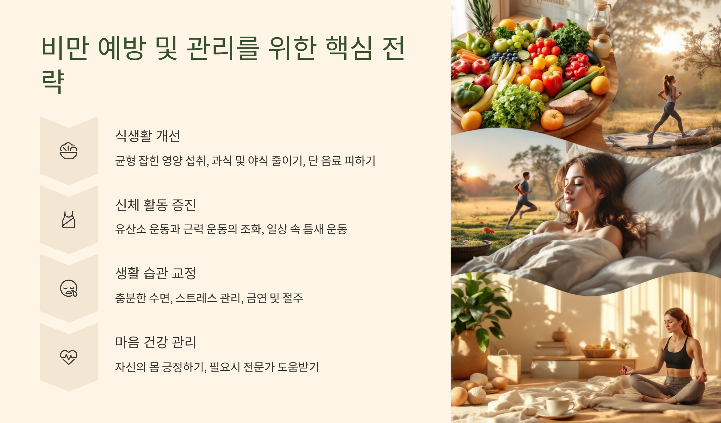 비만은 다양한 원인이 복합적으로 작용하여 발생하지만, 건강한 생활 습관을 통해 충분히 예방하고 관리할 수 있습니다. 지금부터 비만으로부터 자유로워지고 건강한 삶을 유지하기 위한 핵심 전략들을 알아봅시다!