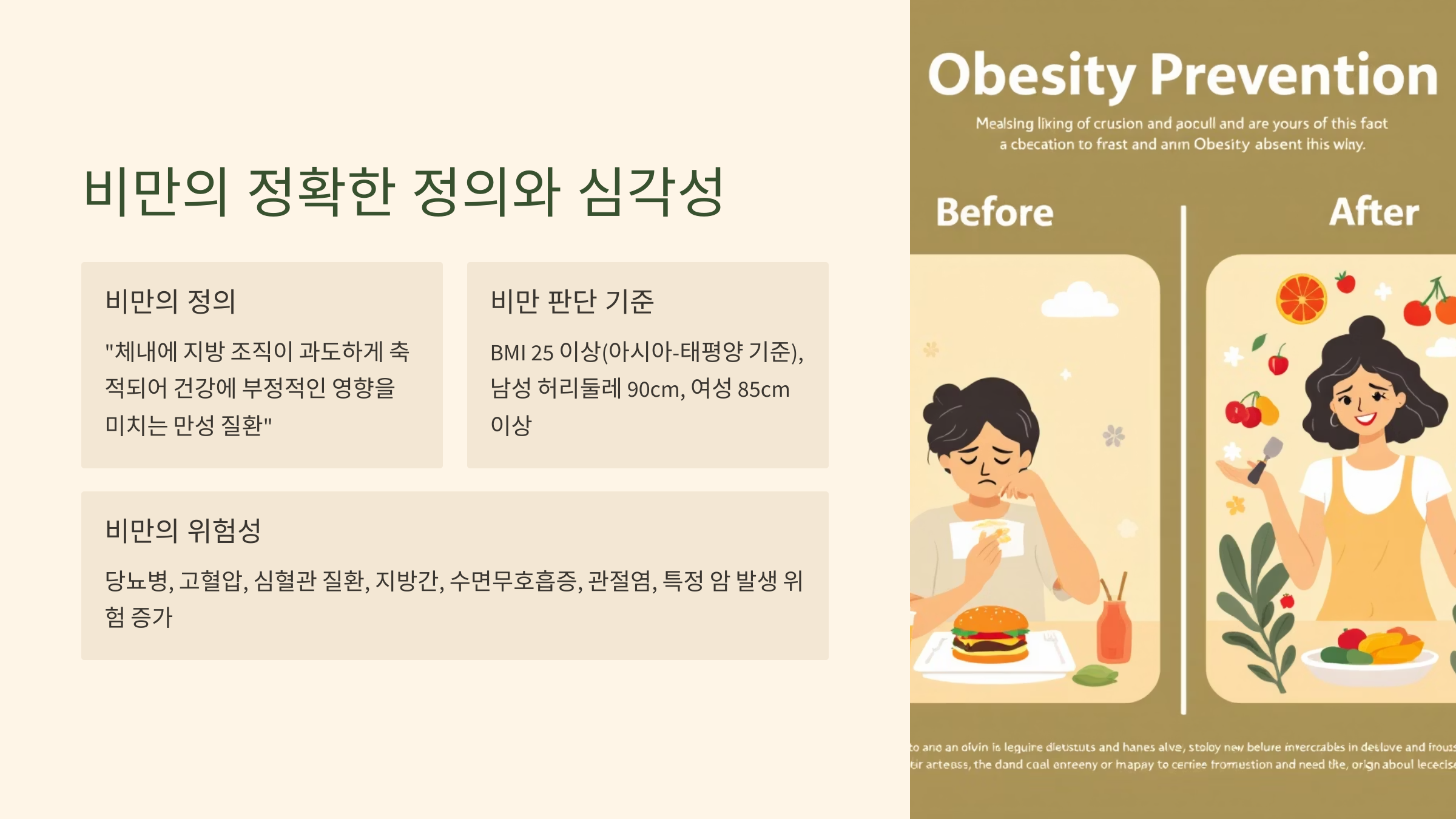 혹시 이런 생각이나 고민을 하고 계신가요? 현대 사회에서 '비만'은 단순히 외모적인 문제를 넘어, 다양한 건강 문제를 야기하는 '질병'으로 인식되고 있습니다. 특히 편리함은 늘었지만 신체 활동은 줄어들고, 고칼로리 음식의 유혹은 넘쳐나는 요즘, 비만 예방과 관리는 남녀노소 누구에게나 중요한 건강 과제가 되었습니다.