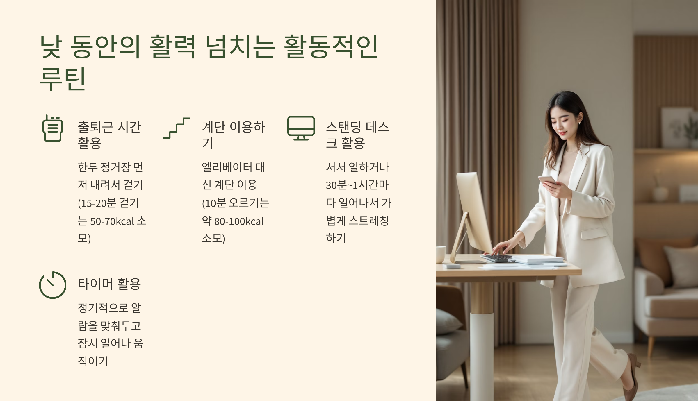 - 사무실에서: 엘리베이터 대신 계단 이용하기(계단 10분 오르기는 약 80-100kcal 소모), 서서 일할 수 있는 스탠딩 데스크 활용, 전화 통화는 서서 하거나 걸으면서 하기, 30분~1시간마다 일어나서 가볍게 스트레칭하거나 제자리 걷기.