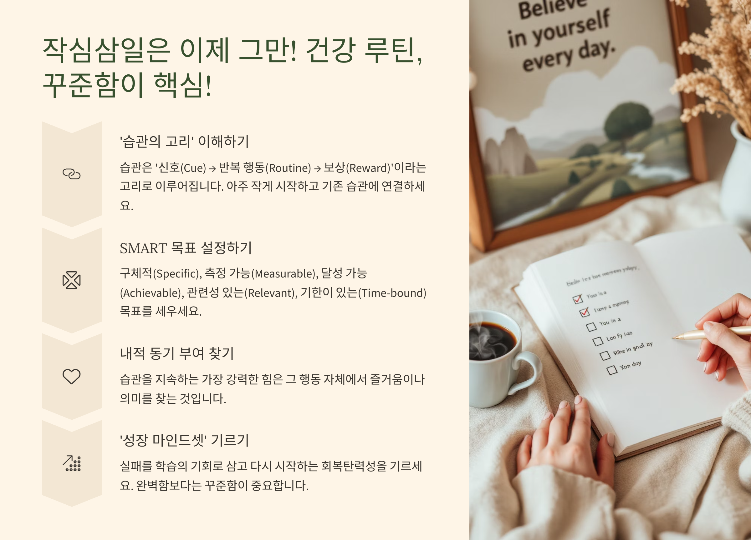 - 작심삼일은 이제 그만! 건강 루틴, 꾸준함이 핵심! (행동 심리학 기반 전략) 💪