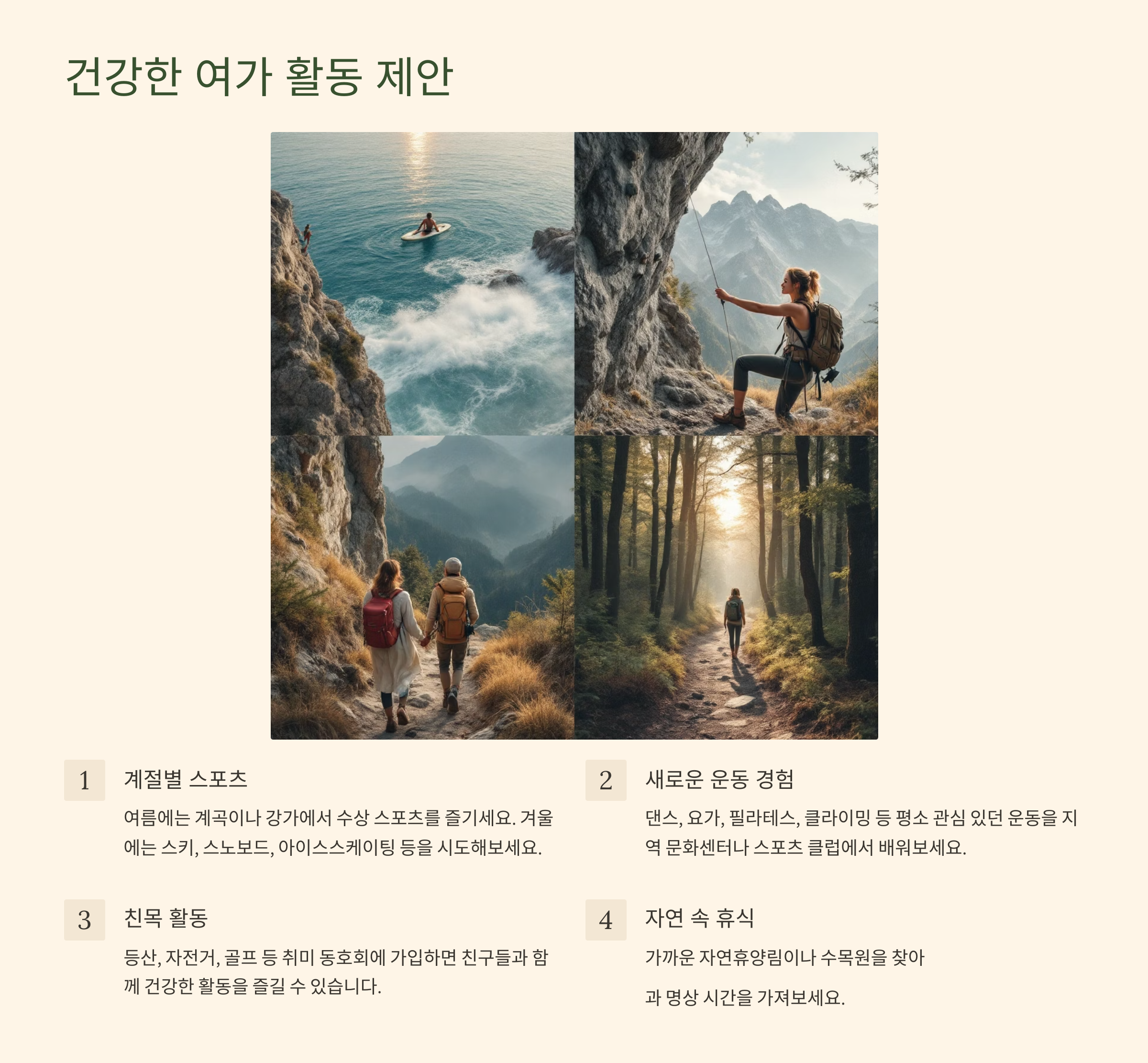 - 새로운 운동 배우기: 댄스, 요가, 필라테스, 클라이밍, 배드민턴, 테니스 등 평소 관심 있었던 운동을 시작해보세요. 지역 문화센터나 스포츠센터의 강좌를 활용하는 것도 좋습니다.