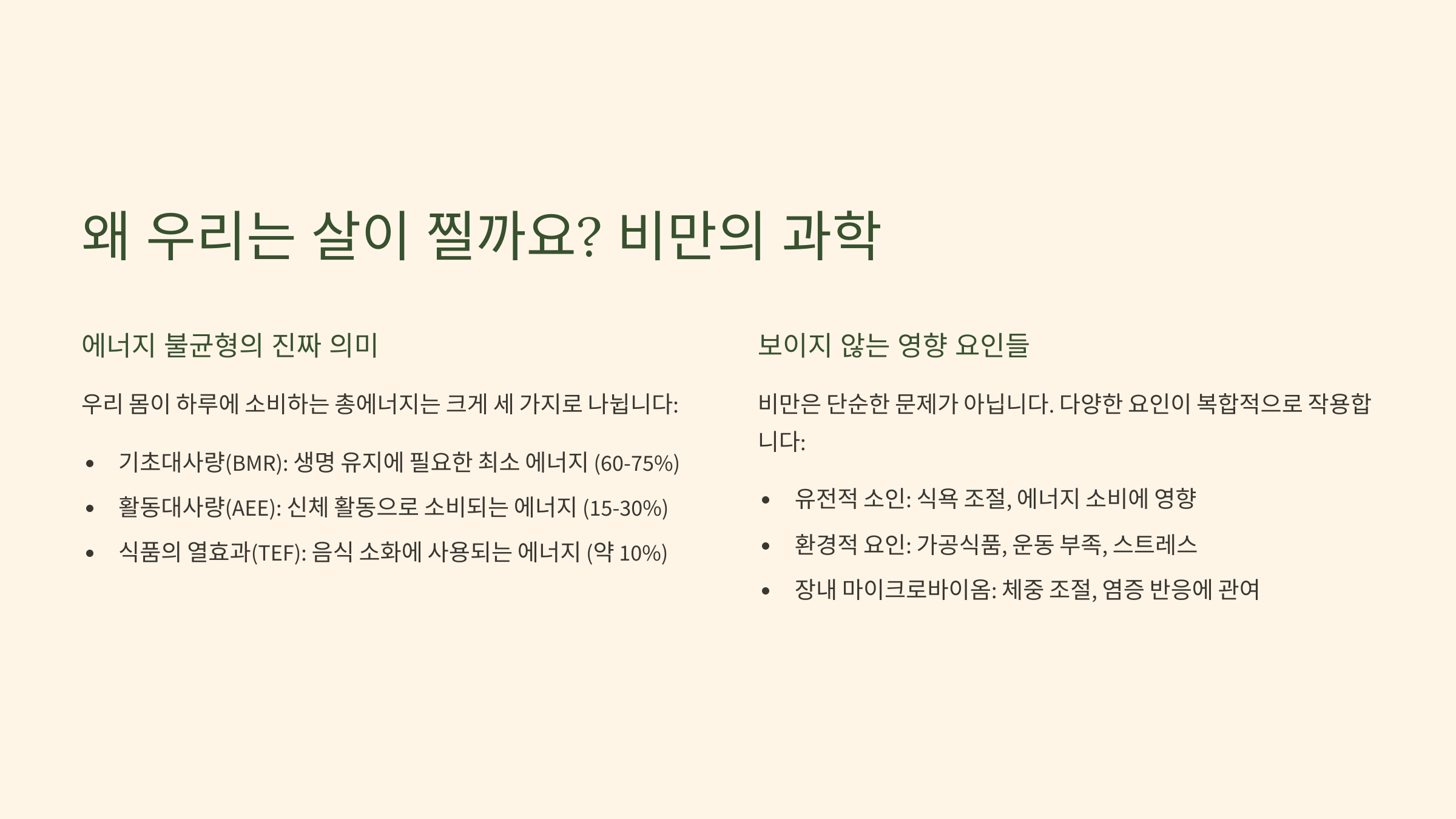 - (1) 단순 칼로리 계산을 넘어선 '에너지 불균형'의 진짜 의미 (기초대사량, 활동대사량, 식품의 열효과 심층 이해)