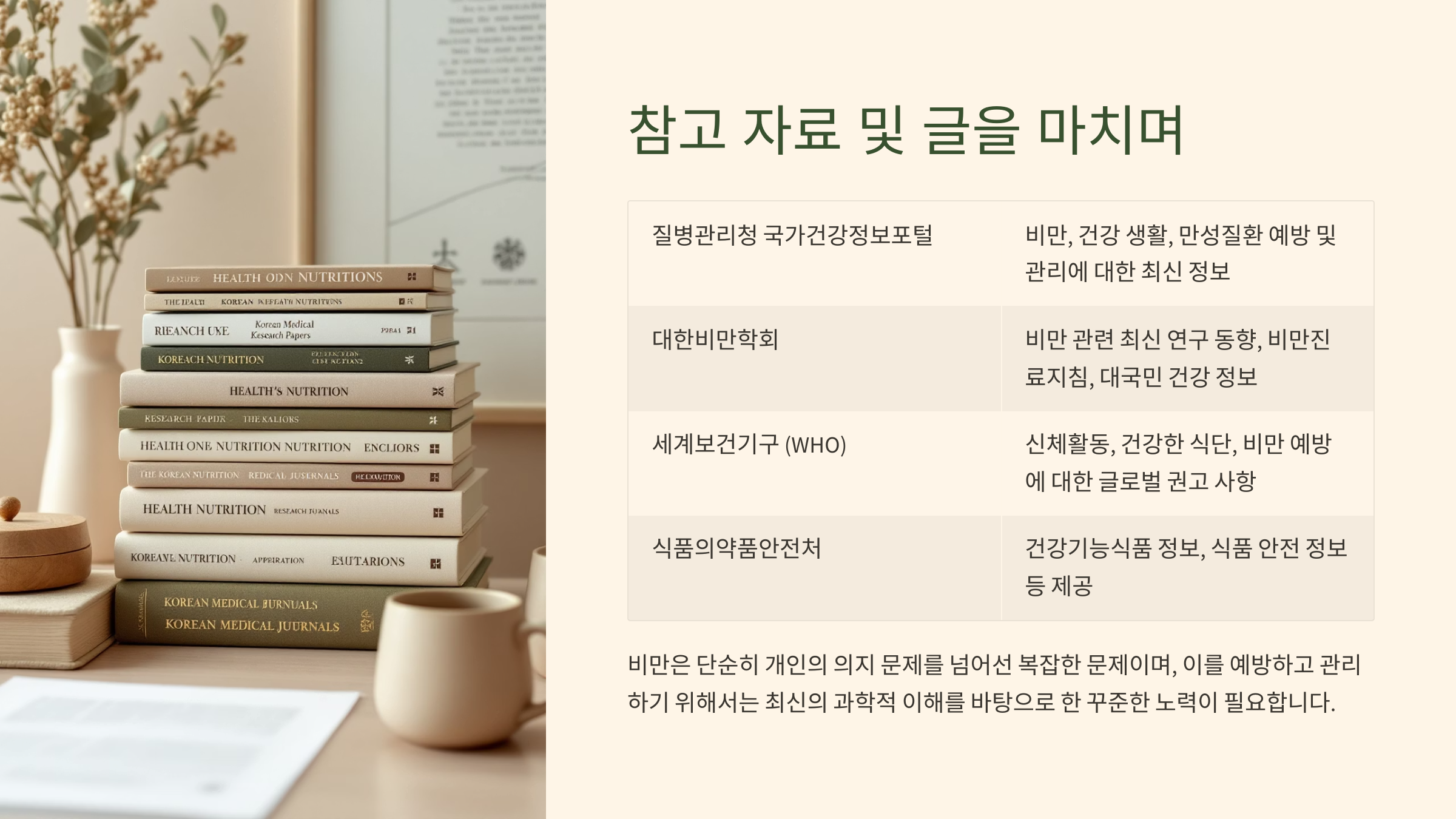 - 질병관리청 국가건강정보포털 (health.kdca.go.kr): 비만, 건강 생활, 만성질환 예방 및 관리에 대한 최신 정보 및 가이드라인 제공. (2023년 이후 자료 지속 업데이트)