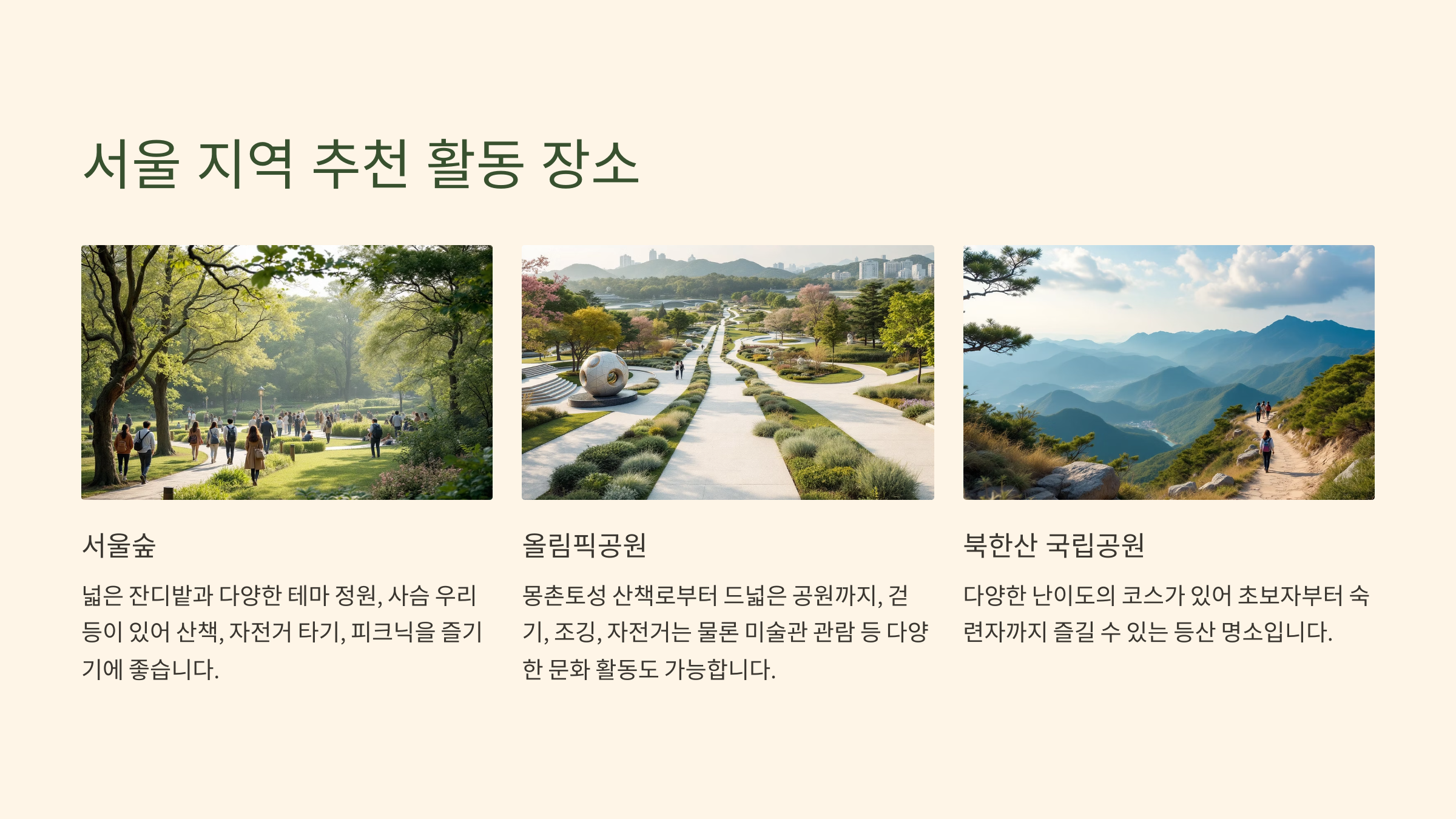 - 북한산 국립공원: 등산을 좋아한다면 서울 근교에서 최고의 선택지 중 하나입니다. 다양한 난이도의 코스가 있어 초보자부터 숙련자까지 즐길 수 있습니다.