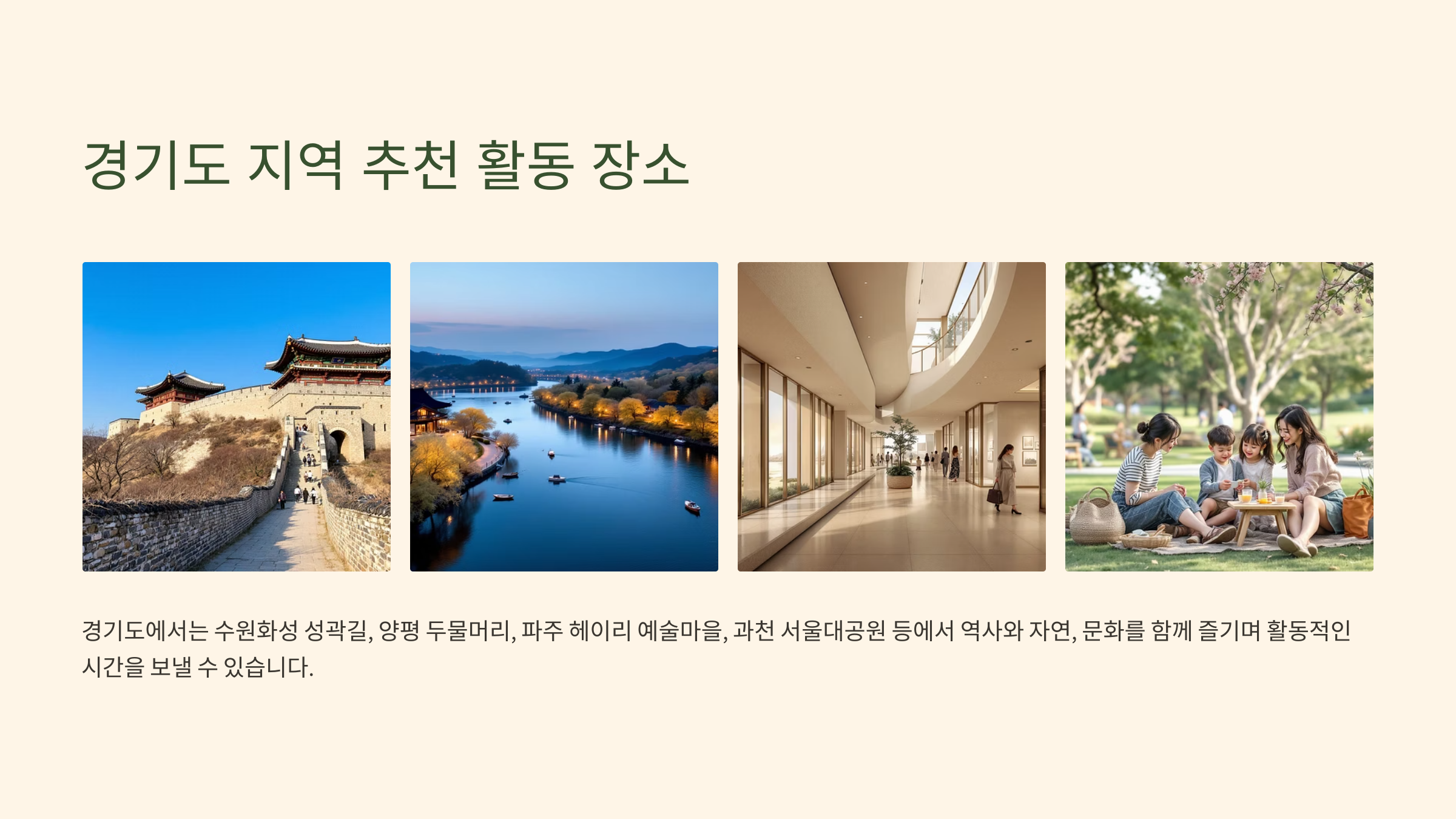 - 수원화성: 유네스코 세계문화유산인 수원화성 성곽길을 따라 걷거나 자전거를 타며 역사와 자연을 함께 느낄 수 있습니다.