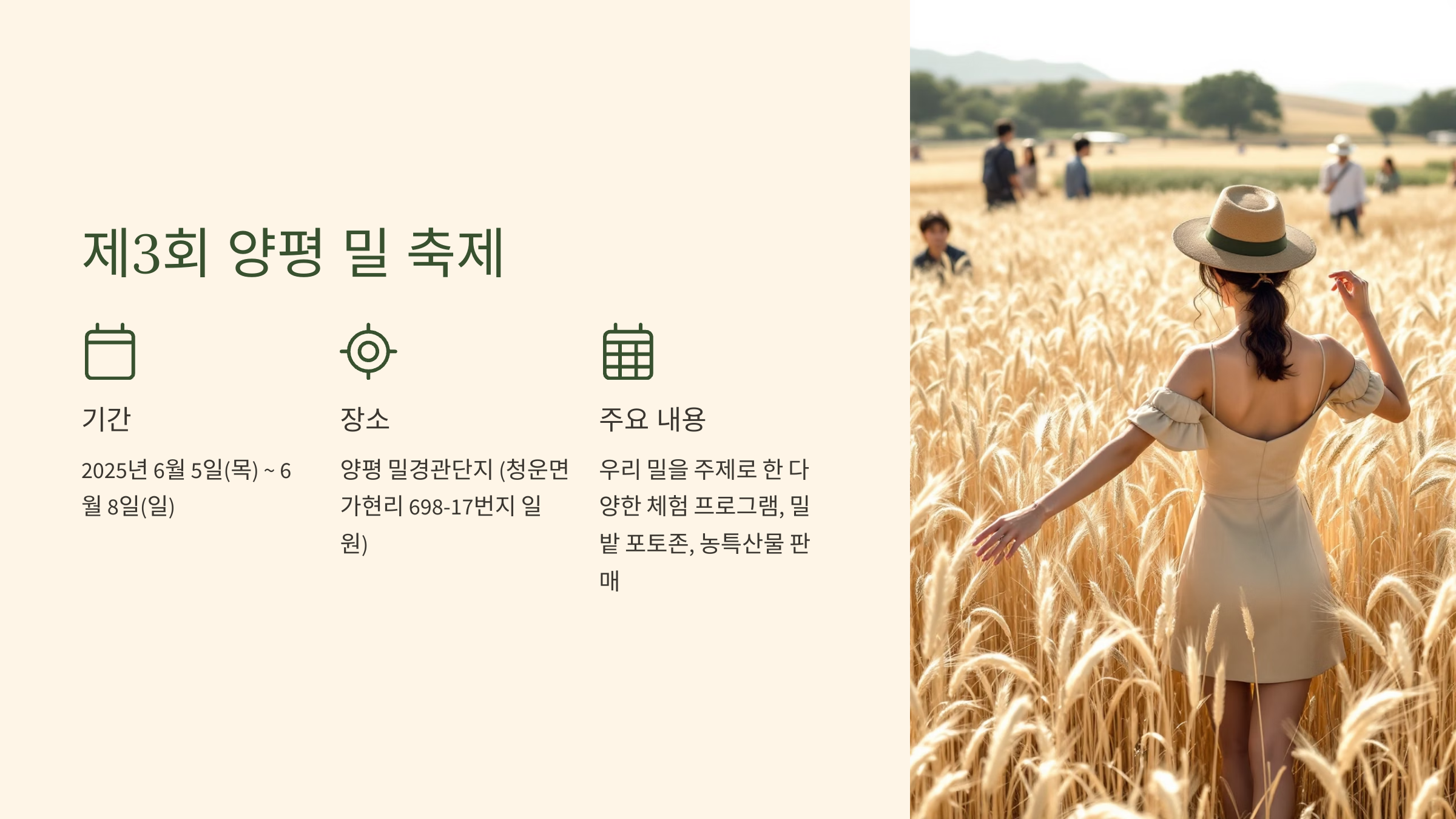 주요 내용: 우리 밀을 주제로 한 다양한 체험 프로그램, 밀밭 포토존, 농특산물 판매 등이 진행됩니다. 밀밭에서 인생샷도 남기고, 건강한 우리밀 제품도 만나보세요!