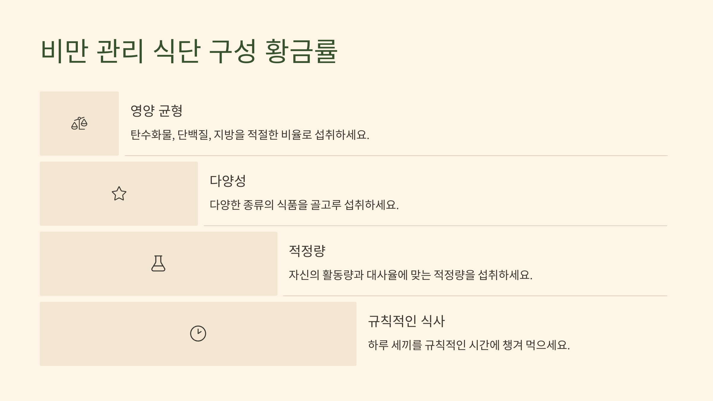 (1) 비만 관리 식단 구성 황금률 (영양 균형, 다양성, 적정량, 규칙적인 식사)