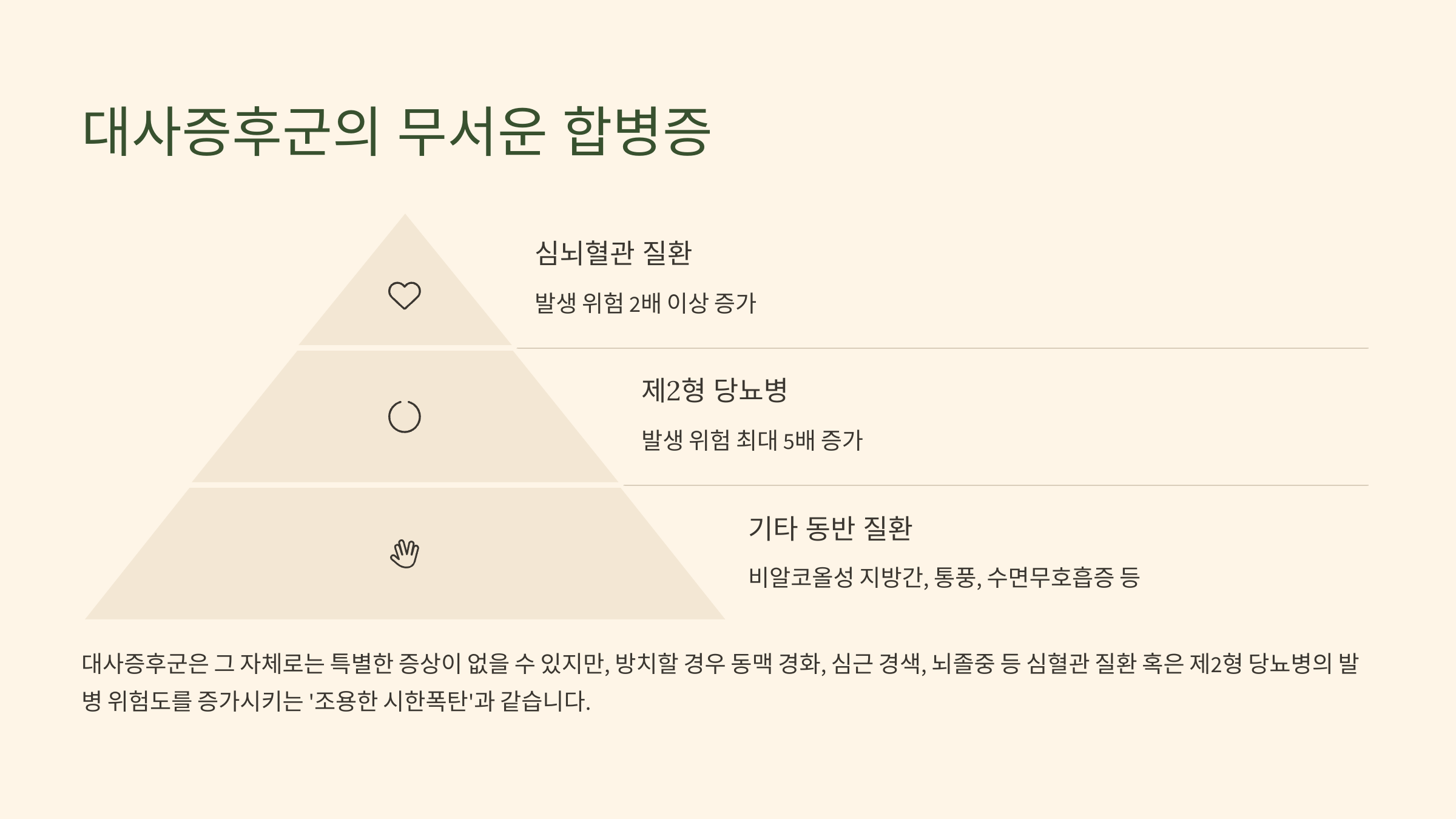 대사증후군은 그 자체로는 특별한 증상이 없을 수 있지만, 방치할 경우 동맥 경화, 심근 경색, 뇌졸중 등 심혈관 질환 혹은 제2형 당뇨병의 발병 위험도를 증가시키는 '조용한 시한폭탄'과 같습니다.