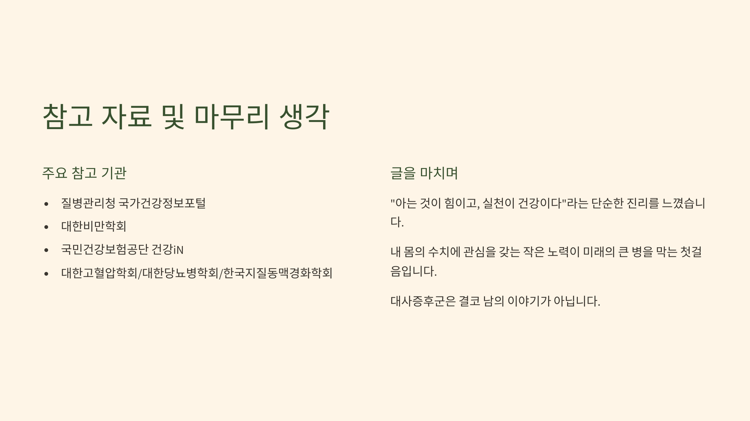 오늘 '대사증후군'이라는 다소 무겁고 복잡할 수 있는 주제에 대해 함께 알아보았는데요. 글을 준비하면서 가장 크게 느낀 점은 "아는 것이 힘이고, 실천이 건강이다"라는 단순한 진리였습니다. 내 몸의 수치들에 조금 더 관심을 가지고, 건강검진 결과를 그냥 넘기지 않는 작은 노력이 미래의 큰 병을 막는 첫걸음이 될 수 있다는 것을 독자분들께 꼭 전달하고 싶었습니다. 대사증후군은 결코 남의 이야기가 아니며, 오늘 알려드린 정보들이 여러분의 건강한 삶을 지키는 데 작은 등불이 되기를 바랍니다.