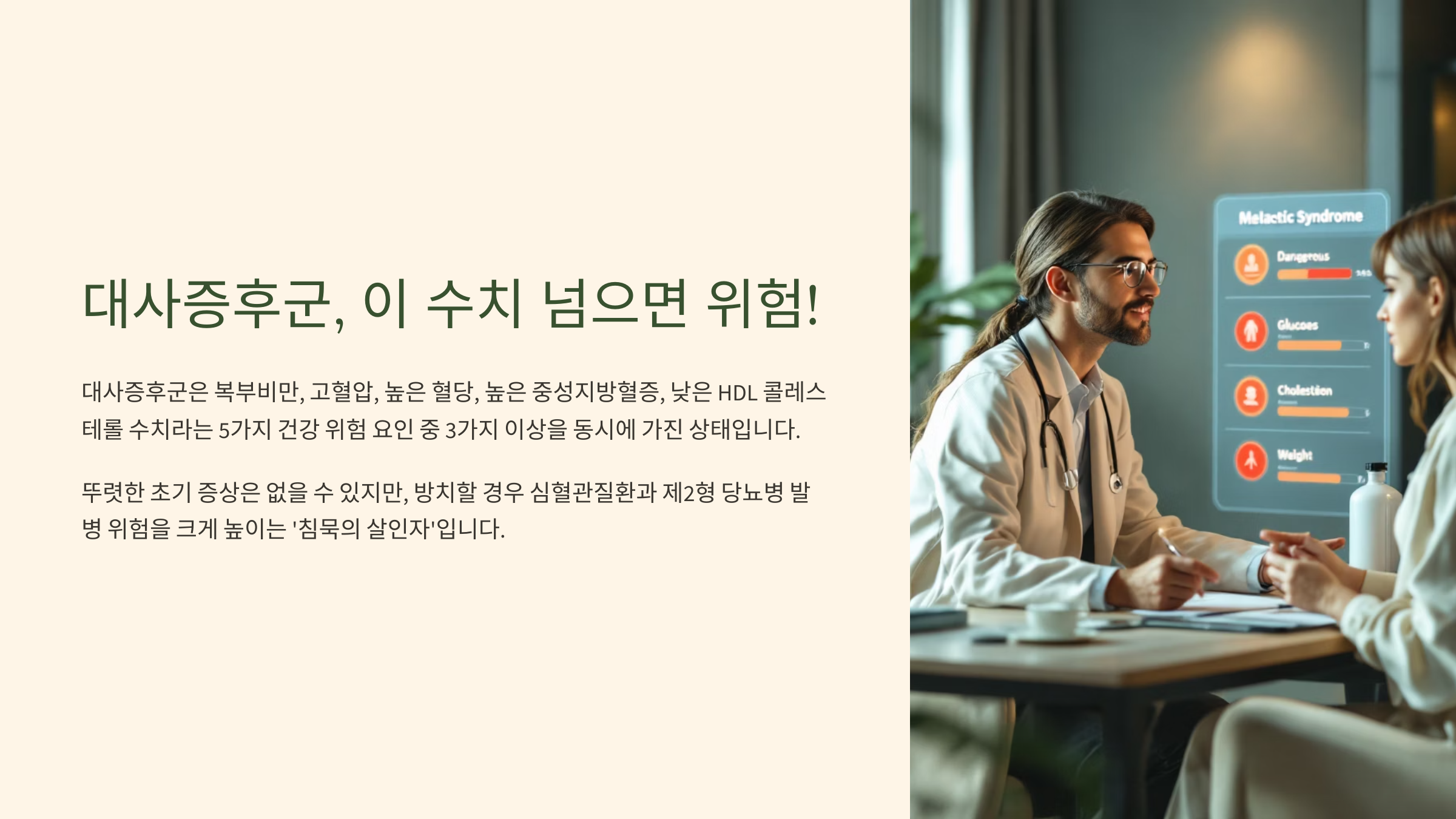 오늘 핼시노트 '건강 생활' 편에서는 소리 없이 다가오는 건강의 적신호, 대사증후군이란 정확히 무엇이며 얼마나 위험한지, 그리고 가장 중요한 대사증후군 진단 기준 5가지 핵심 수치에 대해 알기 쉽게 총정리해 드립니다. 내 몸이 보내는 위험 신호를 조기에 발견하고 건강한 삶을 지키는 데 도움이 되기를 바랍니다! (질병관리청, 대한비만학회, 국민건강보험공단 등 최신 자료 참고)