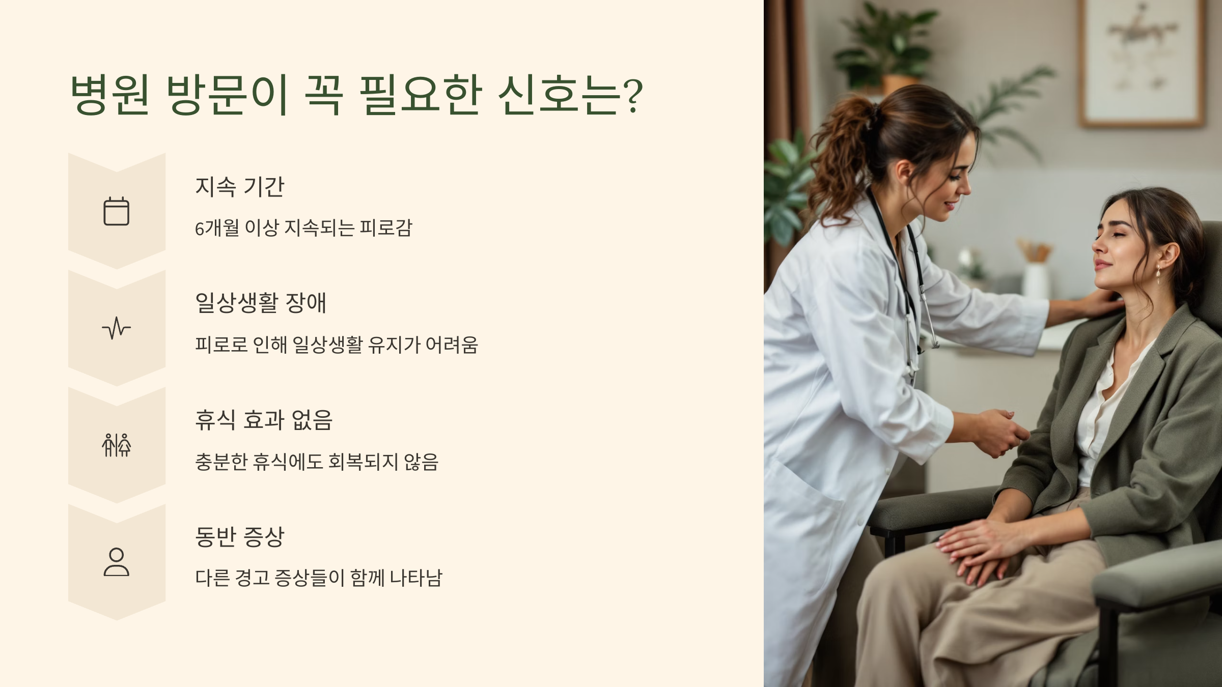 피로감이 일상생활을 심각하게 방해하고, 충분한 휴식으로도 회복되지 않으며, 다른 경고 증상들이 동반된다면 더 이상 망설이지 말고 병원을 방문해야 합니다.