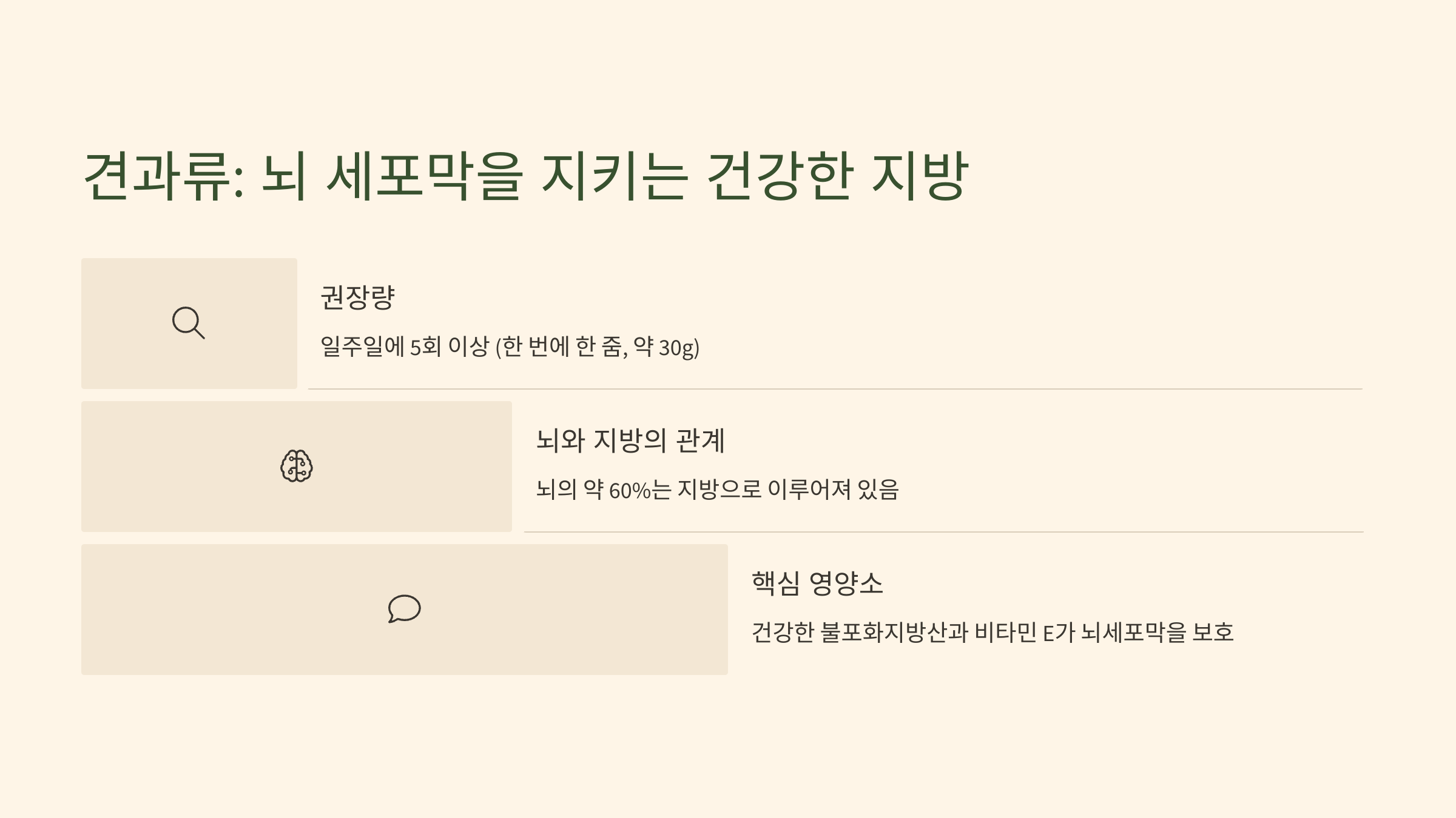 - 왜 좋을까?: 뇌의 약 60%는 지방으로 이루어져 있습니다. 견과류에 풍부한 건강한 불포화지방산은 뇌세포막을 부드럽고 유연하게 만들어 신경 신호가 원활하게 전달되도록 돕습니다. 또한, 강력한 지용성 항산화제인 비타민 E는 지방으로 이루어진 뇌세포막이 활성산소에 의해 손상되는 것을 막아주는 보호막 역할을 합니다. 특히 호두에는 식물성 오메가-3인 알파리놀렌산(ALA)이 풍부해 뇌 건강에 더욱 이롭습니다.