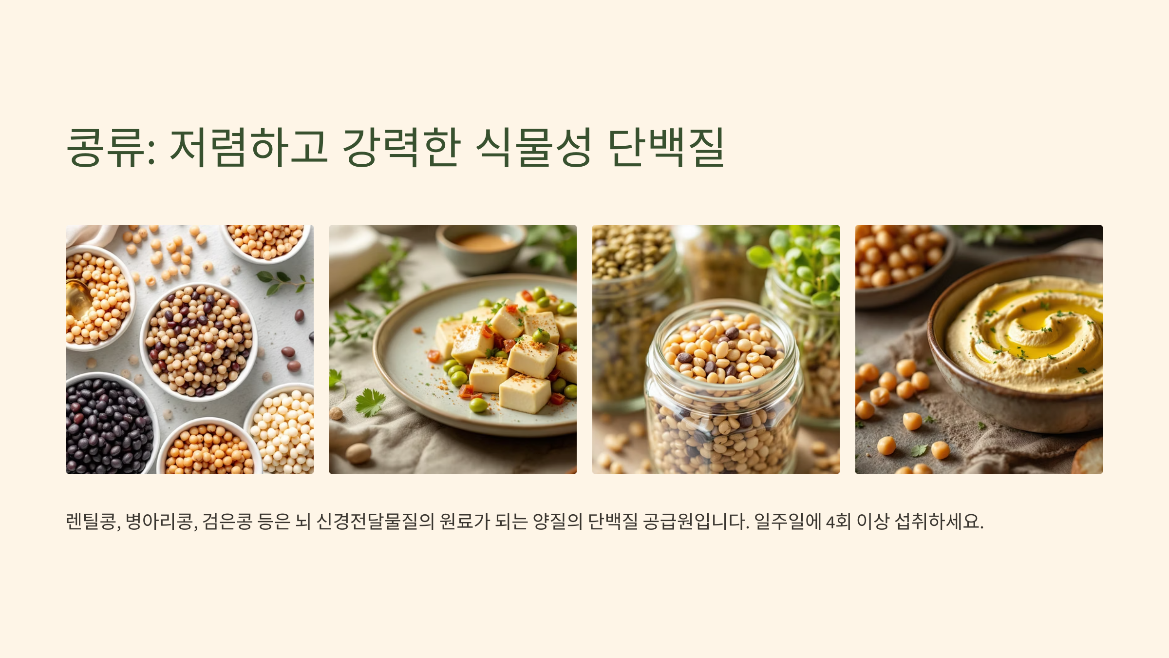 - 왜 좋을까?: 렌틸콩, 병아리콩, 검은콩 등은 뇌 신경전달물질(세로토닌, 도파민 등)의 원료가 되는 양질의 단백질 공급원입니다. 또한 기억력 향상에 도움이 되는 엽산과 '천연 이완제' 마그네슘, 그리고 혈당을 안정시키는 식이섬유가 풍부하여 적은 비용으로 최고의 뇌 건강 효과를 낼 수 있는 완벽한 식품입니다.