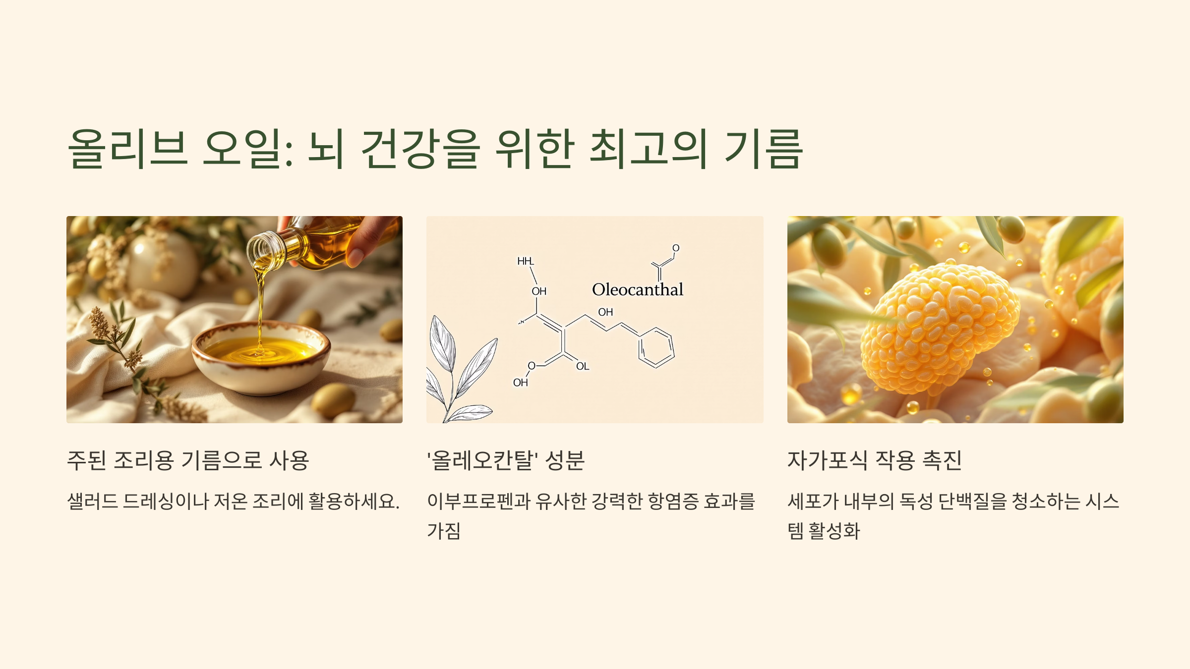- 왜 좋을까?: 엑스트라 버진 올리브 오일에 풍부한 '올레오칸탈'이라는 성분은 이부프로펜과 유사한 강력한 항염증 효과를 가집니다. 이는 뇌의 만성적인 염증을 줄여줍니다. 또한 올리브 오일은 뇌의 '자가포식(autophagy)' 작용을 촉진하는 것으로 알려져 있습니다. 자가포식이란 세포가 스스로 내부의 쓰레기(독성 단백질 등)를 청소하는 시스템으로, 올리브 오일이 이 청소 시스템을 활성화시켜 뇌를 깨끗하게 유지하는 데 도움을 주는 것입니다.