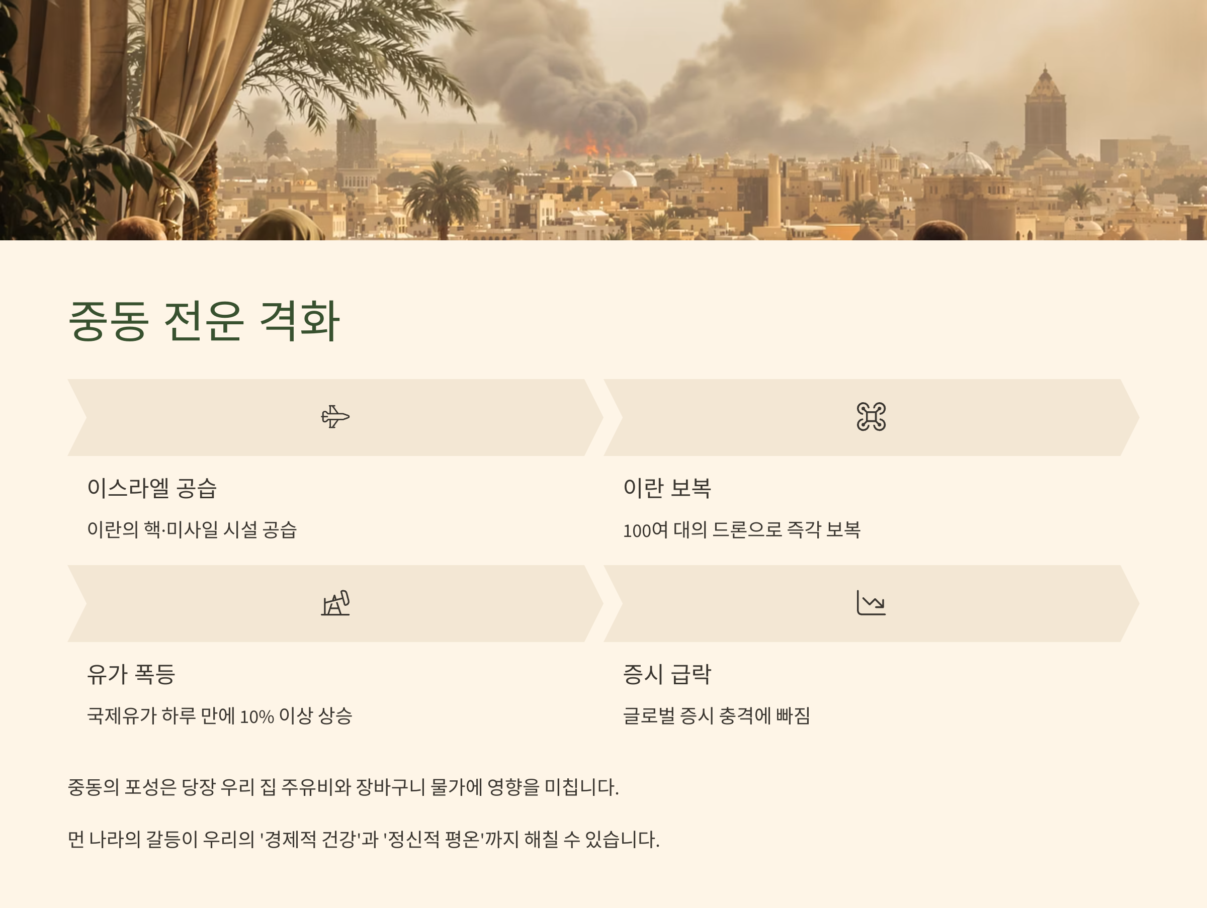 지난 13일, 이스라엘이 이란의 핵·미사일 시설을 공습하고 이란이 100여 대의 드론으로 즉각 보복에 나서면서 중동 지역의 군사적 긴장이 극에 달했습니다. 이란 최고 군 지휘관 3명이 사망하는 등 확전 우려가 커지자, 국제유가는 하루 만에 10% 이상 폭등하고 글로벌 증시는 급락하는 등 전 세계가 충격에 빠졌습니다.