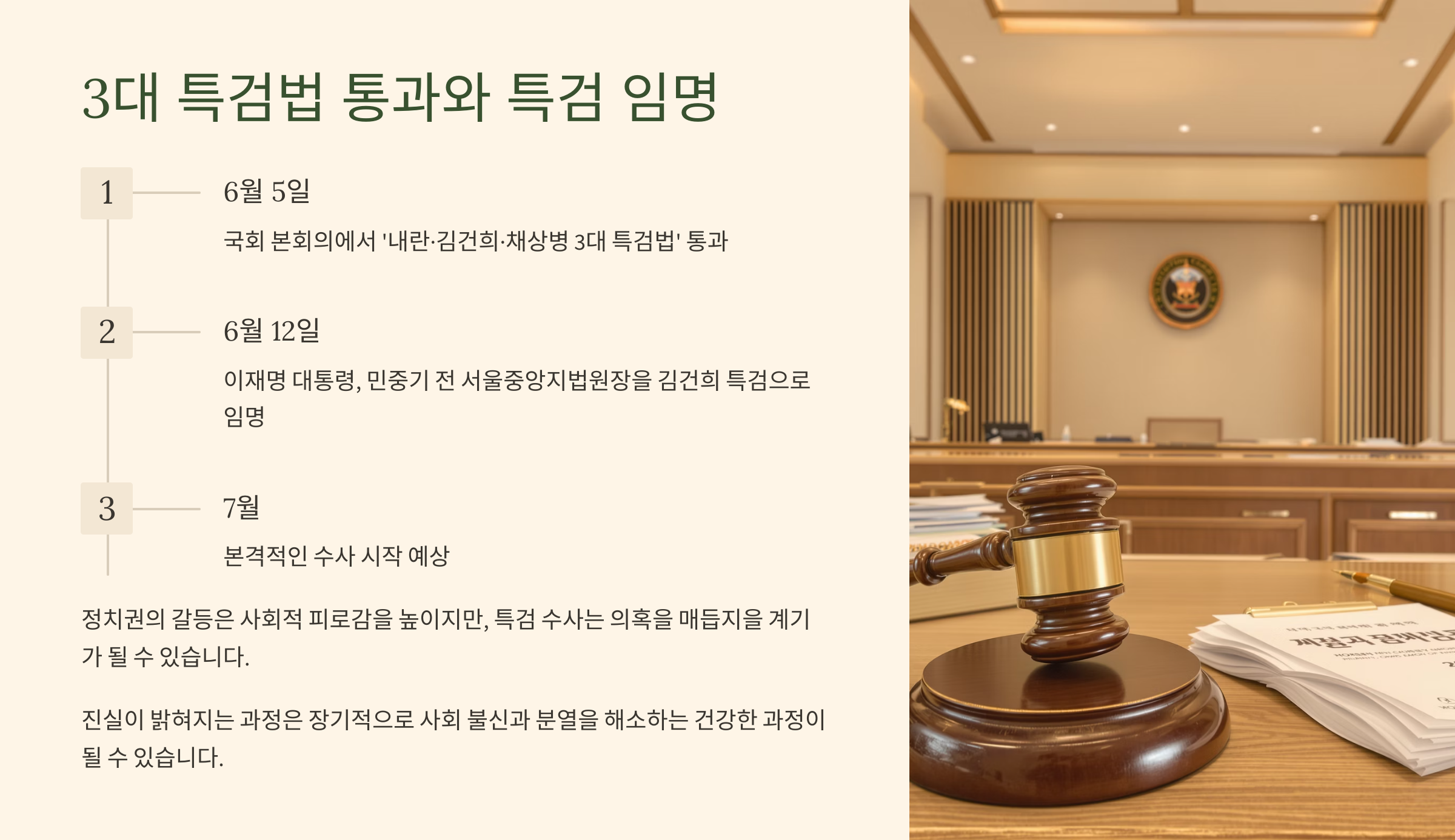 정치권의 갈등 심화는 분명 사회적 피로감을 높이는 일입니다. 하지만 다른 한편으로, 이번 특검법 통과와 수사 개시는 윤석열 정부 때부터 해소되지 않았던 각종 의혹과 사회적 논란을 매듭지을 중요한 계기가 될 수 있습니다. 진실이 명명백백하게 밝혀지는 과정은, 당장은 혼란스러울 수 있어도 장기적으로는 우리 사회의 불신과 분열을 해소하고, 사법 시스템에 대한 신뢰를 회복하는 건강한 과정이 될 수 있습니다. 국민들이 가졌던 오랜 의문이 풀리는 계기가 될지 지켜보는 것이 중요합니다.