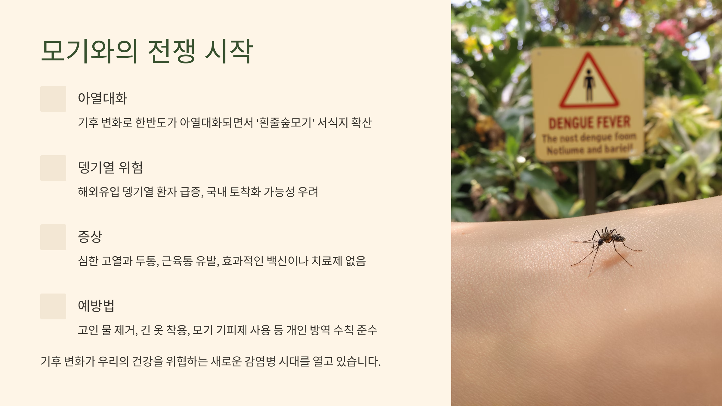 기후 변화로 한반도가 아열대화되면서, 과거 동남아 등 해외에서만 유행하던 뎅기열을 옮기는 '흰줄숲모기'의 국내 서식지가 빠르게 확산하고 있습니다. 최근 해외유입 뎅기열 환자가 급증하는 가운데, 국내에서 모기에 물려 감염되는 '토착화' 가능성에 대한 우려가 커지고 있습니다.
