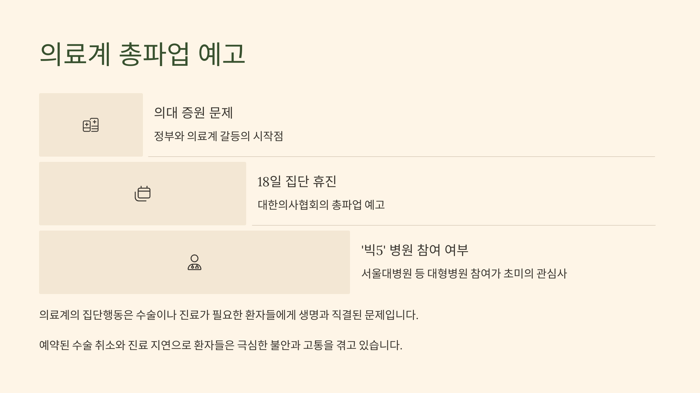 의대 증원 문제로 시작된 정부와 의료계의 갈등이 봉합되지 않고, 결국 대한의사협회가 오는 18일 집단 휴진(총파업)을 예고했습니다. 서울대병원을 시작으로 '빅5' 병원들의 휴진 참여 여부가 초미의 관심사로 떠오르면서, 의료 공백에 대한 우려가 현실화되고 있습니다.
