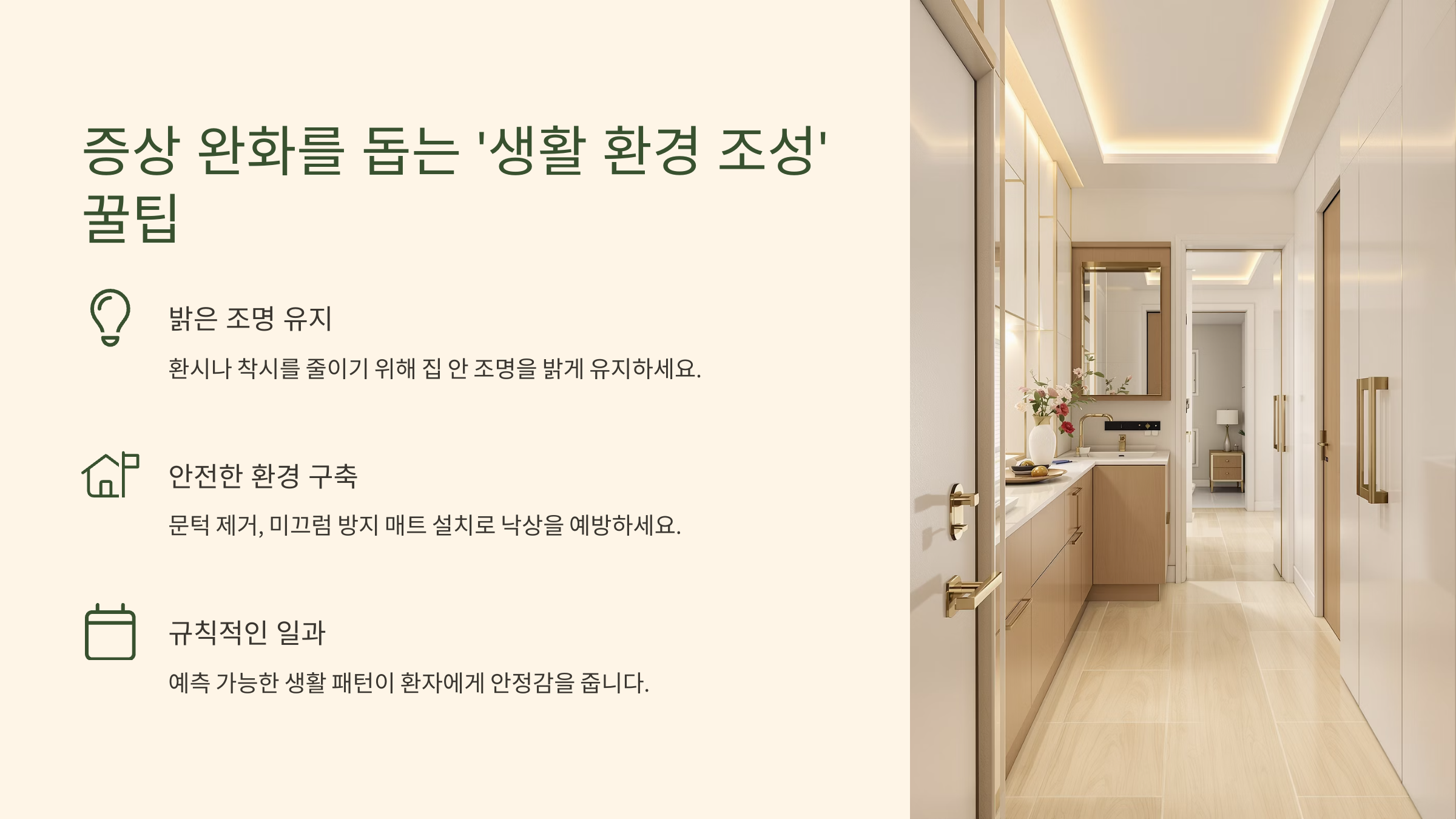 환시나 착시를 줄이기 위해 집 안 조명을 밝게 유지하고, 복잡한 패턴의 벽지나 커튼은 피하는 것이 좋습니다. 거울에 비친 자신의 모습을 다른 사람으로 오인할 수 있으므로, 거울은 가려두는 것도 방법입니다. 또한, 앞서 강조했듯 낙상 예방을 위해 문턱을 제거하고, 화장실 바닥에 미끄럼 방지 매트를 까는 등 안전 설비를 갖추는 것이 필수입니다.