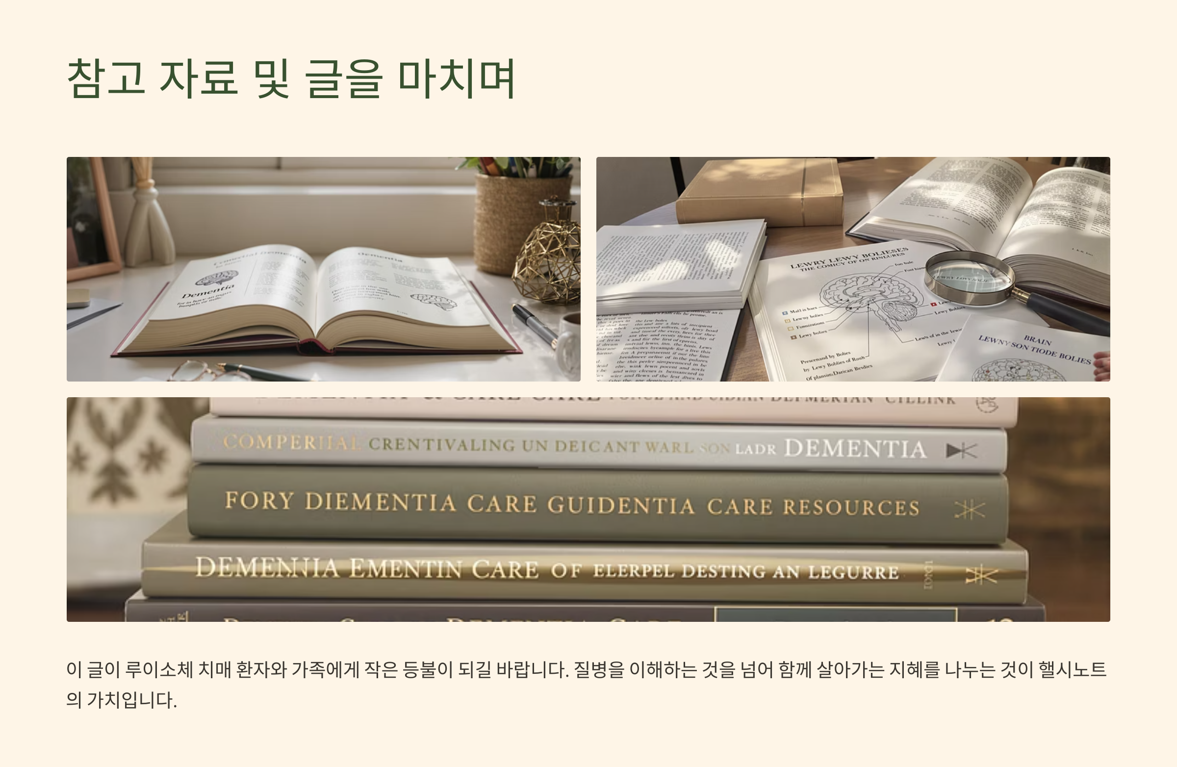 이 글을 준비하면서, 루이소체 치매 환자와 가족이 겪는 혼란과 막막함이 얼마나 클지 다시 한번 생각하게 되었습니다. 예측할 수 없는 증상의 파도 속에서 매일을 버텨내는 것은 정말 힘든 일일 겁니다. 그래서 이번 글에서는 의학적 지식 나열을 넘어, '그래서 우리는 당장 무엇을 할 수 있는가'에 대한 실질적인 답을 드리고 싶었습니다. 질병을 이해하는 것을 넘어, 그 질병과 '함께 살아가는 지혜'를 나누는 것. 그것이 핼시노트가 추구하는 진정한 건강 정보의 가치라고 믿습니다.