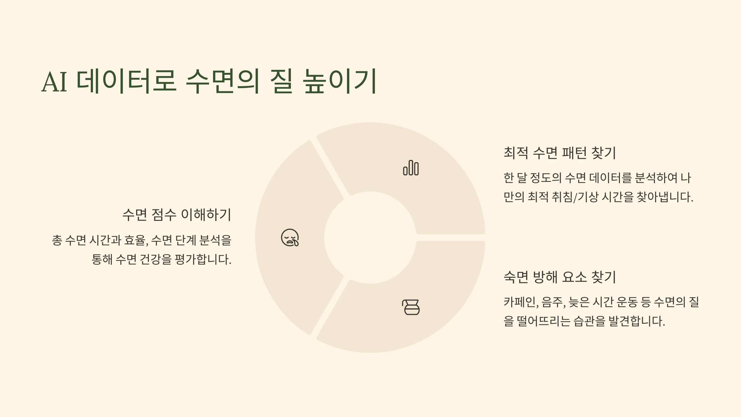 AI는 나의 생활 데이터와 수면 데이터를 교차 분석하여 수면의 질을 떨어뜨리는 숨은 원인을 명탐정처럼 찾아줍니다.