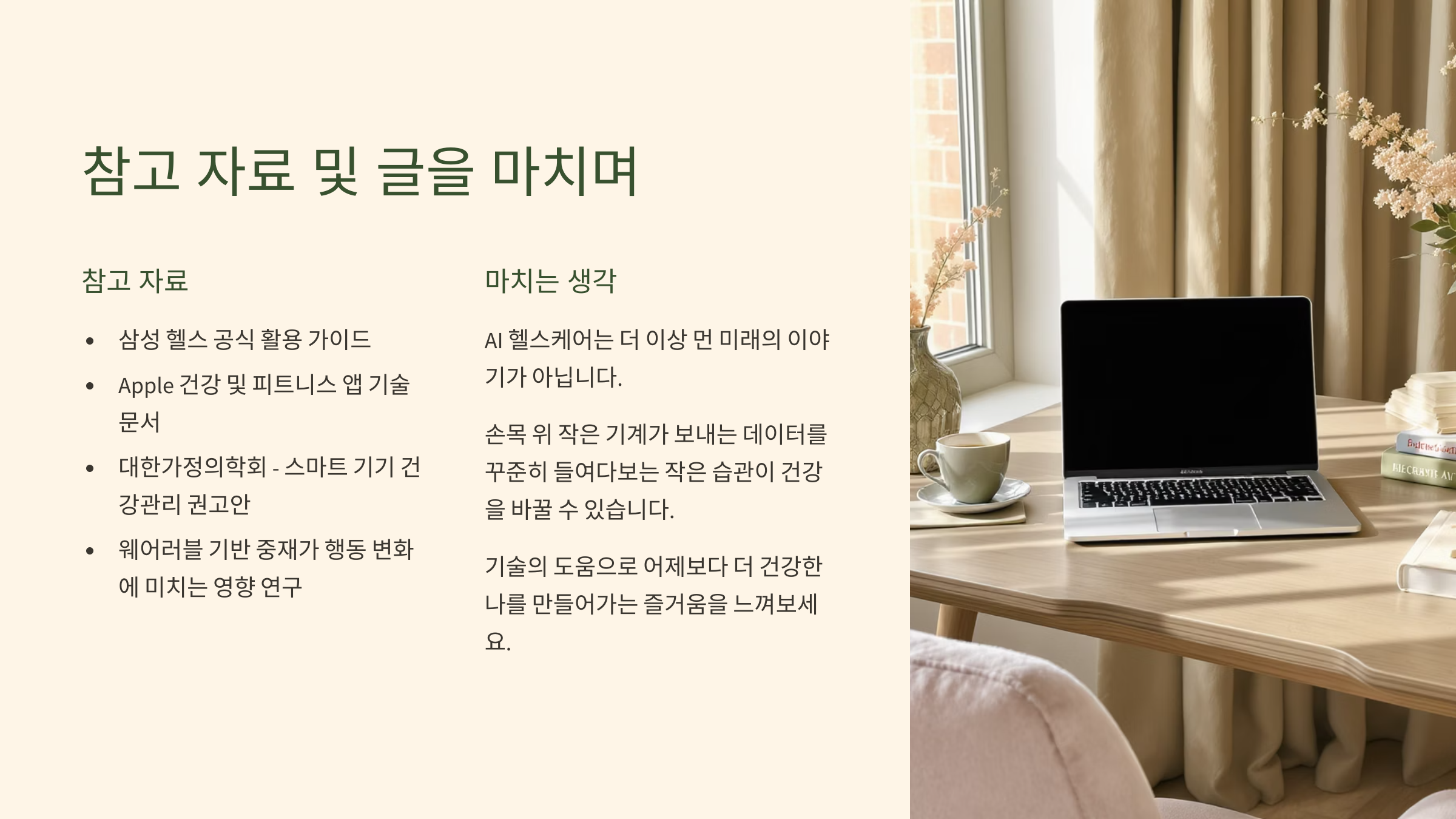 AI 헬스케어는 더 이상 먼 미래의 이야기가 아닙니다. 손목 위 작은 기계가 보내는 데이터를 꾸준히 들여다보는 작은 습관이, 1년 뒤, 10년 뒤 나의 건강을 바꿀 수 있다는 사실이 정말 흥미롭게 다가왔습니다. 기술의 도움을 받아 어제보다 더 건강한 나를 만들어가는 즐거움을 많은 분들이 느끼셨으면 좋겠습니다.