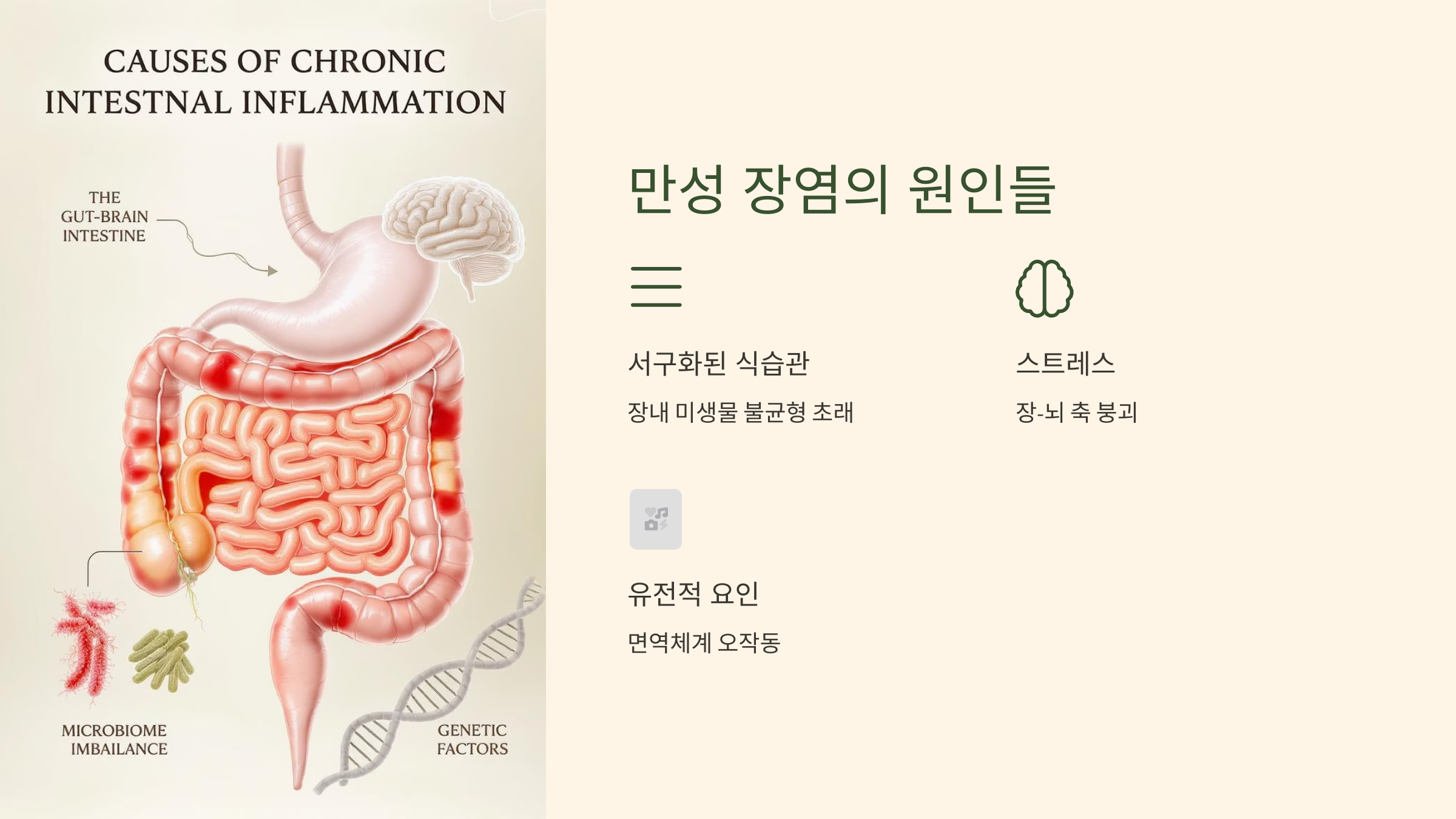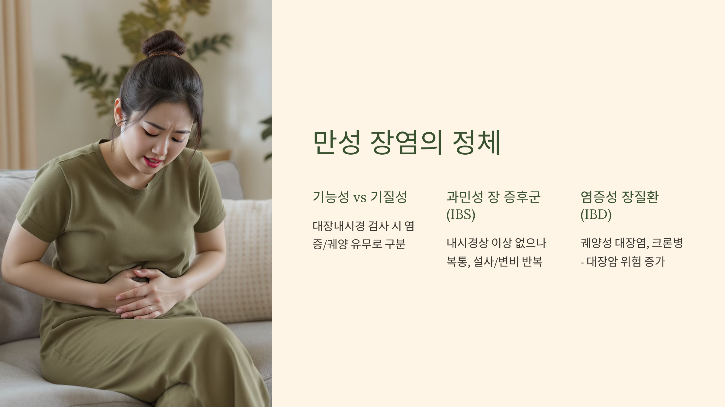 혹시 이런 증상, '원래 장이 좀 예민해서 그래'라며 대수롭지 않게 넘기고 계신가요? 😥 하지만 반복되는 복통과 설사, 변비는 우리 몸, 특히 '장'이 보내는 중요한 건강 경고등일 수 있습니다. 많은 분들이 '만성 장염'이라는 말을 흔히 사용하지만, 이 안에는 단순 기능성 질환부터 대장암의 씨앗이 될 수 있는 무서운 염증성 질환까지 포함되어 있다는 사실, 알고 계셨나요?