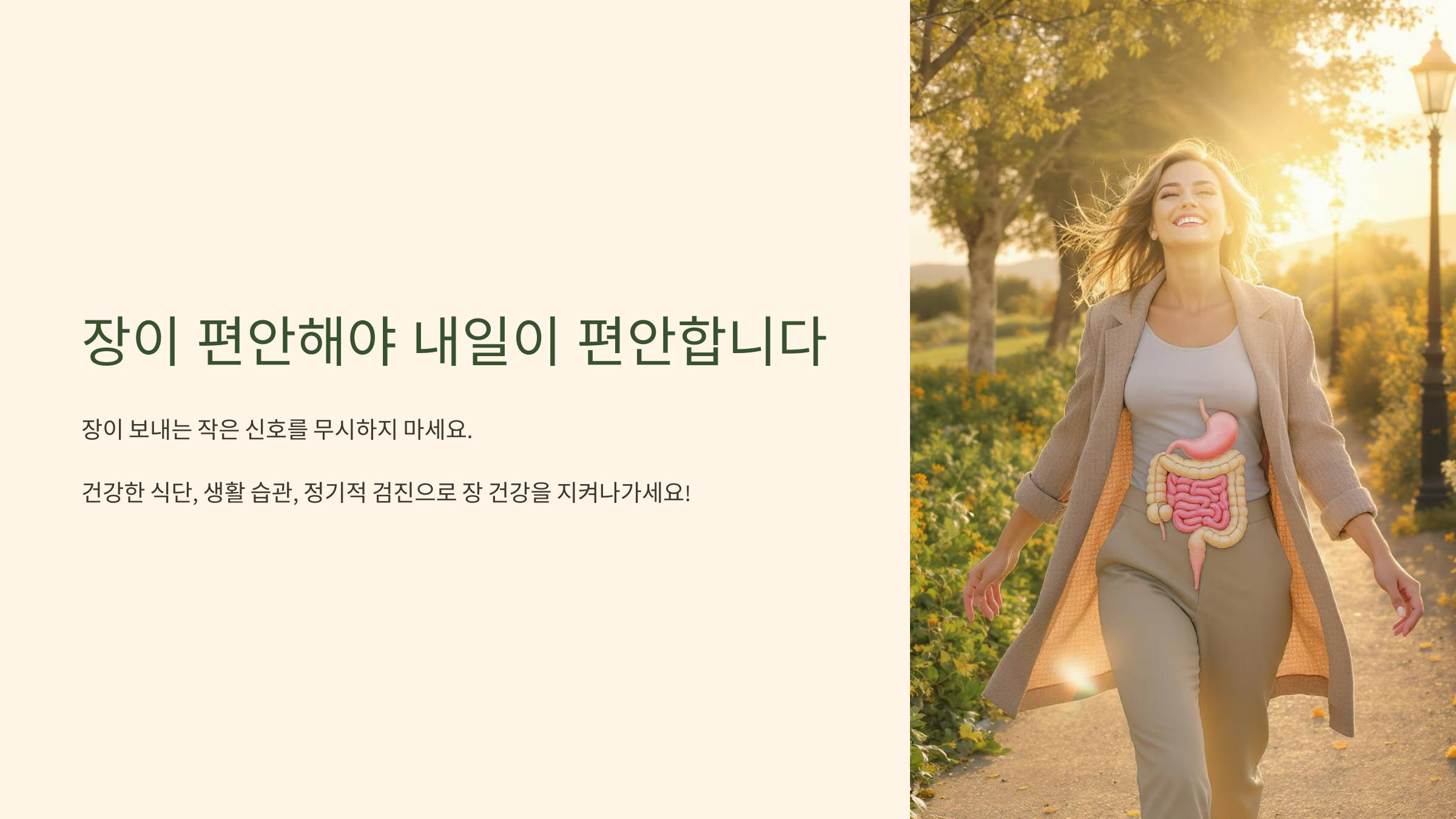 우리 몸의 중심, 장 건강은 전신 건강의 바로미터입니다. 장이 보내는 작은 신호를 무시하지 마세요. 오늘부터 건강한 식단과 생활 습관으로 나의 장을 돌보고, 정기적인 검진으로 장 건강을 지켜나가는 현명한 당신이 되기를 닥터리 건강TV가 응원합니다! 이 글이 도움이 되셨다면 공감(❤️)과 댓글로 소통해주세요! 궁금한 점이나 다음 주제 제안도 언제든지 환영합니다! 😊