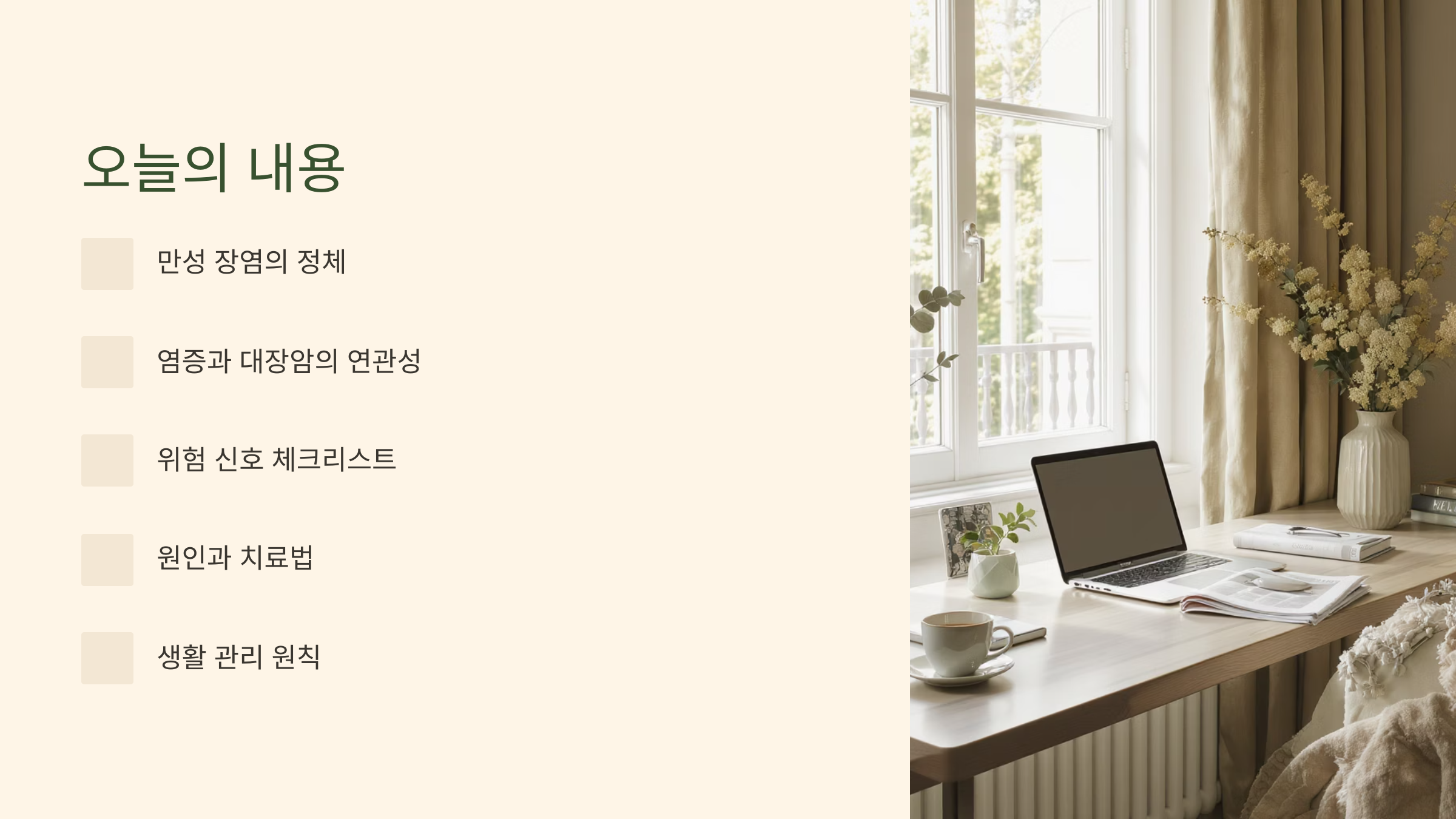 이번 글을 준비하며, '만성 장염'이라는 익숙한 말 속에 숨겨진 위험성을 많은 분들이 간과하고 계실 수 있겠다는 생각이 들었습니다. 특히 '염증'이 오랜 시간 지속될 때 우리 몸에 얼마나 큰 부담을 주는지, 그리고 이것이 암과 같은 심각한 질병으로 이어질 수 있다는 연결고리를 명확히 알려드리는 것이 중요하다고 느꼈습니다. 부디 이 글이 '나는 괜찮겠지'라는 막연한 생각에서 벗어나, 나의 장 건강을 적극적으로 돌아보고, 필요한 경우 용기를 내어 병원을 찾는 계기가 되기를 진심으로 바랍니다.